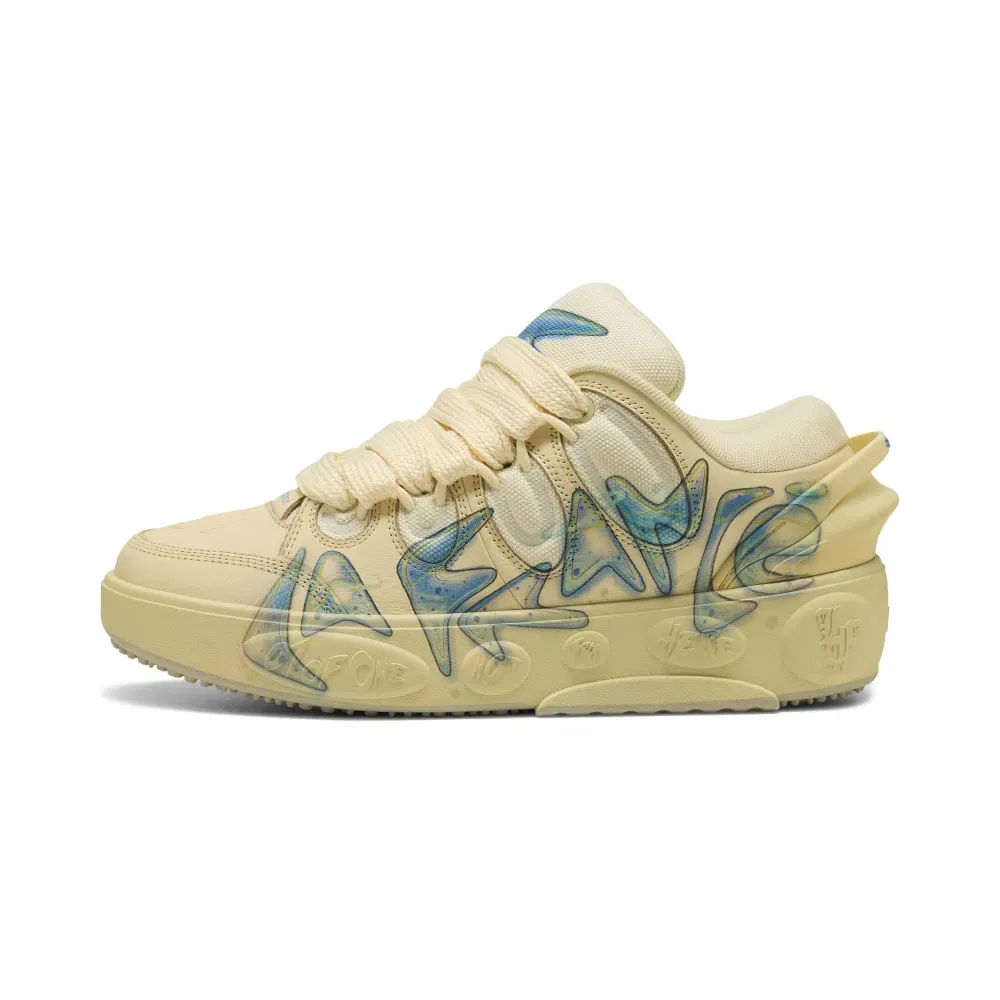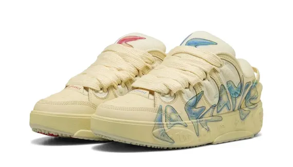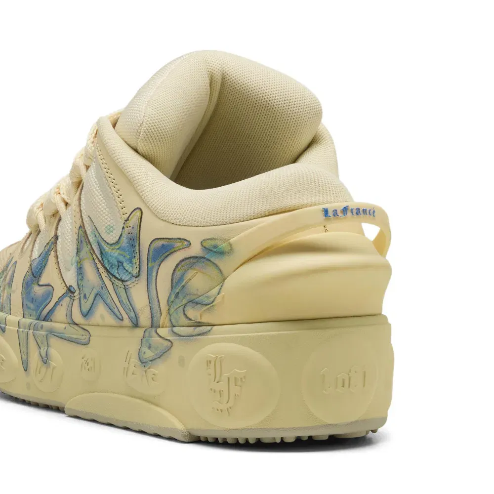 Pour le huitième coloris de la paire, la tige a été habillée d'un blanc cassé avec du bleu et du rouge pour apporter du contraste et faire ressortir l'inscription “La Francé” (qui est le deuxième prénom de LaMelo Ball), en rouge sur la chaussure droite et en bleu sur la gauche. Même chose pour le “LaFrancé” sous la semelle, en rouge sous la semelle droite et bleu sous la gauche.