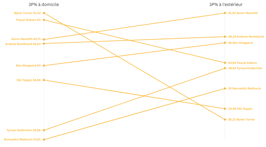 Myles Turner et Pascal Siakam sont d’ailleurs particulièrement précis au Gainbridge Fieldhouse, avec plus de 50% de réussite de loin pour les deux hommes, alors qu’Aaron Nesmith et Andrew Nembhard sont de leur côté aux alentours de 45%. Contrairement à la saison régulière, Tyrese Haliburton est lui étrangement plus adroit lors des matchs à l’extérieur. Reste donc à voir si ces tendances vont se confirmer lors des prochains matchs.