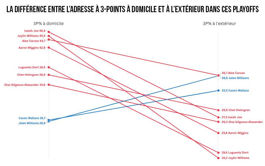 La bonne nouvelle pour la troupe de Rick Carlisle, c’est qu’ils vont désormais retrouver leur salle et leurs fans… mais également que le Thunder a beaucoup plus de mal à trouver la mire loin de ses bases depuis le début des playoffs. Hormis Jalen Williams et Cason Wallace, tous les joueurs (importants) de la rotation shootent ainsi moins bien à l’extérieur. Et aucun ne dépasse les 36.7% à 3-points loin du Paycom Center !