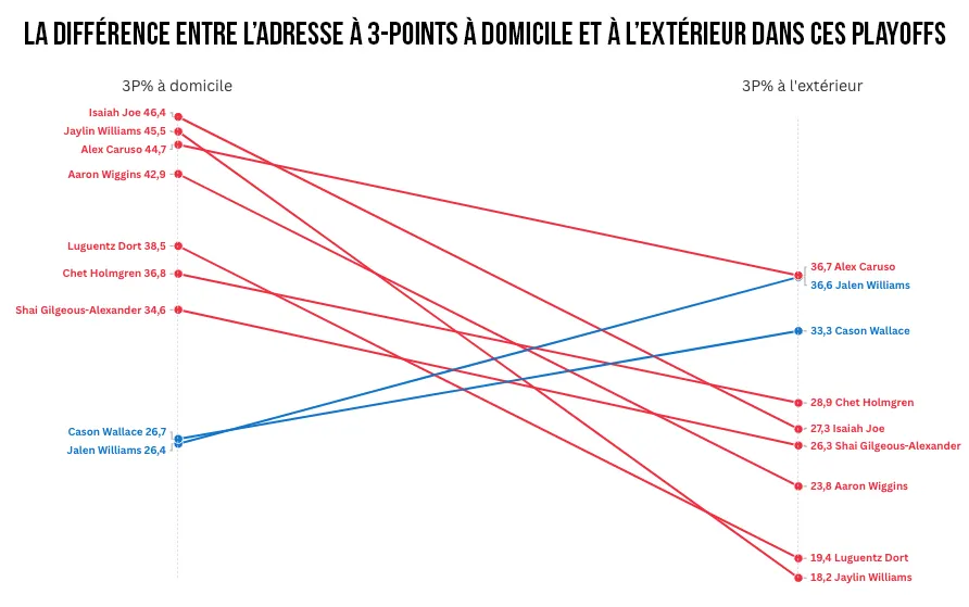 La bonne nouvelle pour la troupe de Rick Carlisle, c'est qu'ils vont désormais retrouver leur salle et leurs fans… mais également que le Thunder a beaucoup plus de mal à trouver la mire loin de ses bases depuis le début des playoffs. Hormis Jalen Williams et Cason Wallace, tous les joueurs (importants) de la rotation shootent ainsi moins bien à l'extérieur. Et aucun ne dépasse les 36.7% à 3-points loin du Paycom Center !