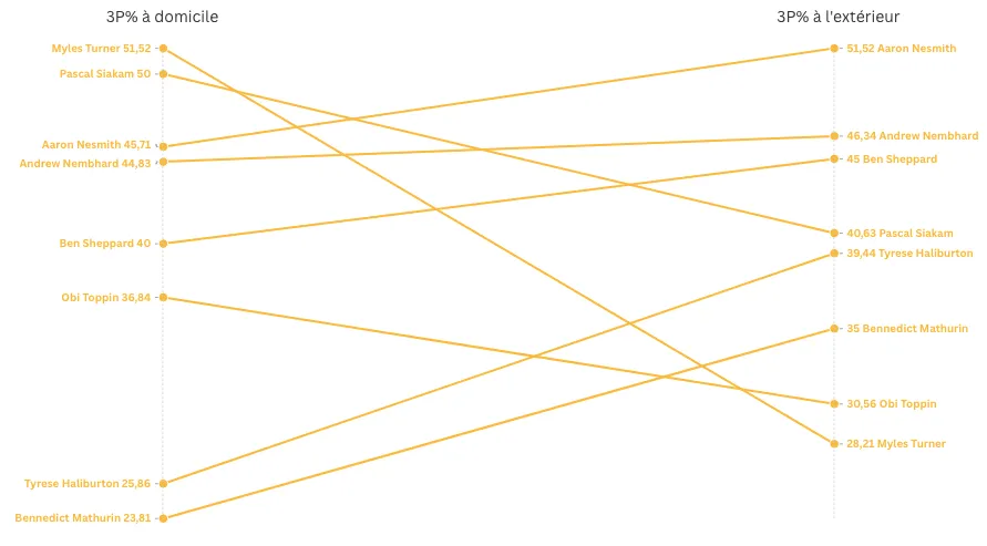 Myles Turner et Pascal Siakam sont d'ailleurs particulièrement précis au Gainbridge Fieldhouse, avec plus de 50% de réussite de loin pour les deux hommes, alors qu'Aaron Nesmith et Andrew Nembhard sont de leur côté aux alentours de 45%. Contrairement à la saison régulière, Tyrese Haliburton est lui étrangement plus adroit lors des matchs à l'extérieur. Reste donc à voir si ces tendances vont se confirmer lors des prochains matchs.