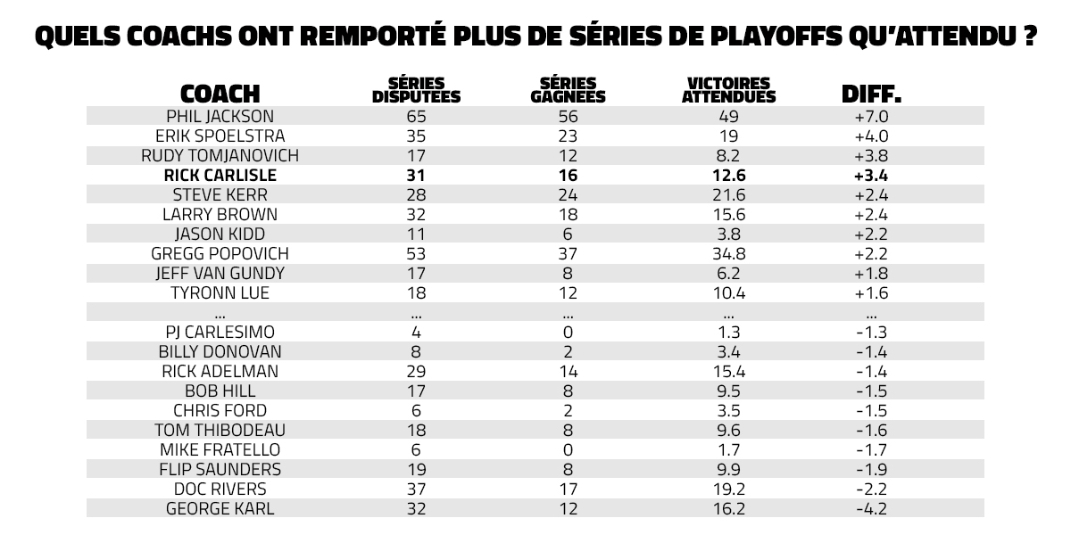 NB : les “victoires attendues” tiennent compte de la cote avant la série. Par exemple, les Bulls sont favoris face aux Lakers lors des Finals 1991, mais leur cote est de 1.5, ce qui signifie que leurs chances de remporter le titre sont estimées à 66%. La “victoire attendue” est donc de 0,66 et pas 1.00. Cette saison, la cote des Pacers en amont de ces Finals était de 6.0, soit 16.7%. Dans ce cas, la “victoire attendue” pour Rick Carlisle et 0.17 et pas 0