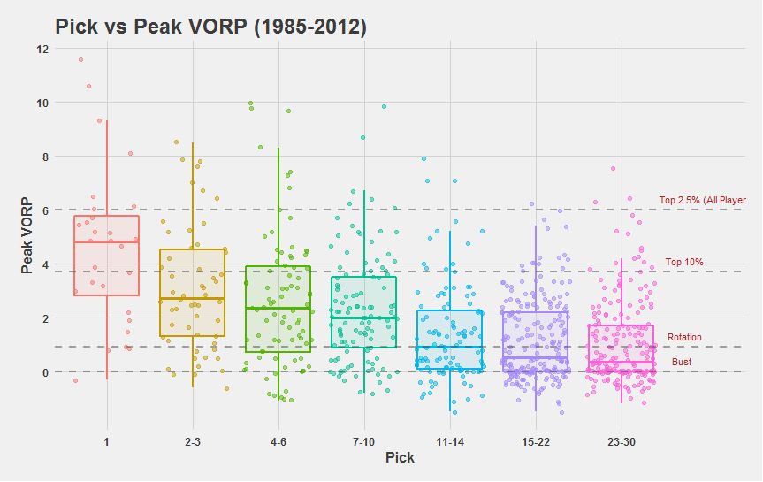 Or les différentes recherches effectuées sur la Draft montrent que la valeur des choix de Draft diminue très vite. Passé le Top 10, il n’y a plus vraiment d’assurance d’obtenir un joueur susceptible d’être utile.
