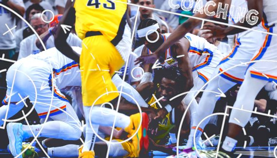 Ben Taylor, de Thinking Basketball, a plusieurs fois décrit cette communication et ce sens de la compensation, qui font que le Thunder n’offre que très peu d’ouvertures à ses adversaires, en particulier à Tyrese Haliburton qui, blessé ou pas, a beaucoup de mal à créer des décalages face à ces quinze marionnettes sur un même fil.