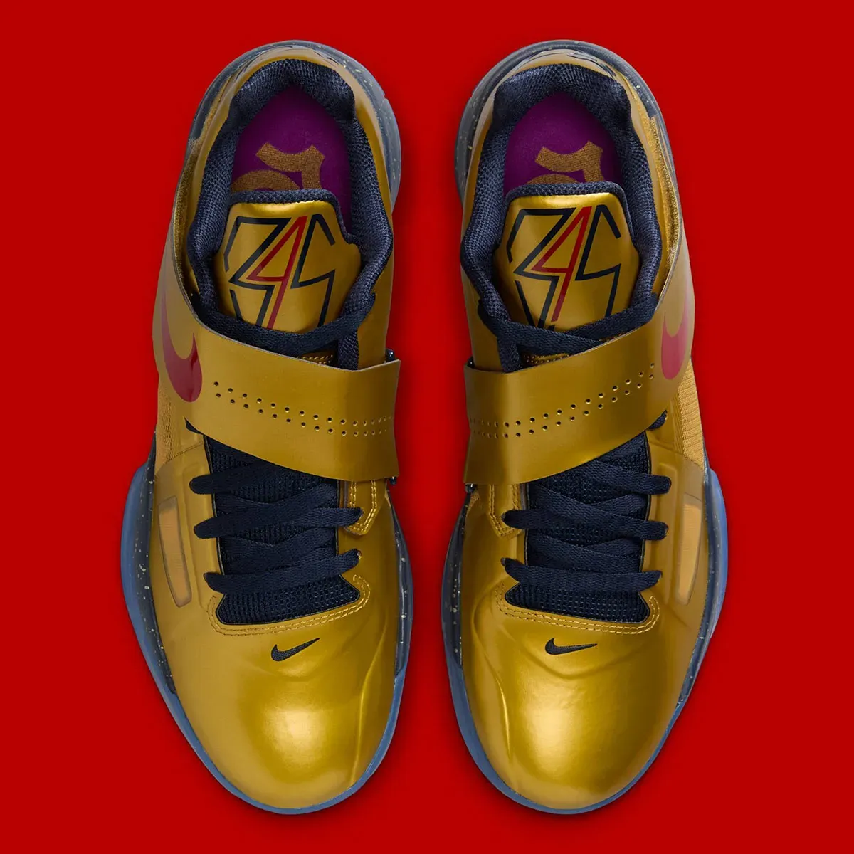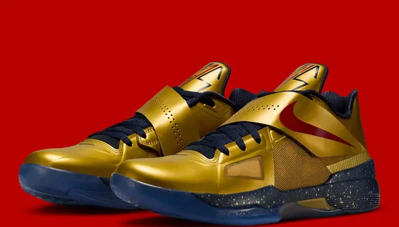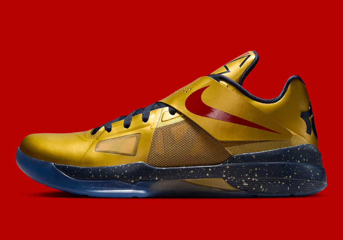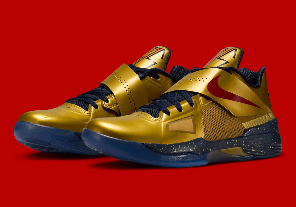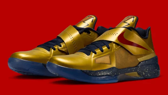 Après la KD 4 « Easter » il y a deux mois, c’est maintenant le coloris « Gold Medal » qui s’apprête à réinvestir le marché. L’idée était de célébrer le titre de champion olympique obtenu par Kevin Durant en 2012 sous les couleurs de Team USA, avec une tige dorée assortie d’un « Swoosh » rouge sur le scratch.