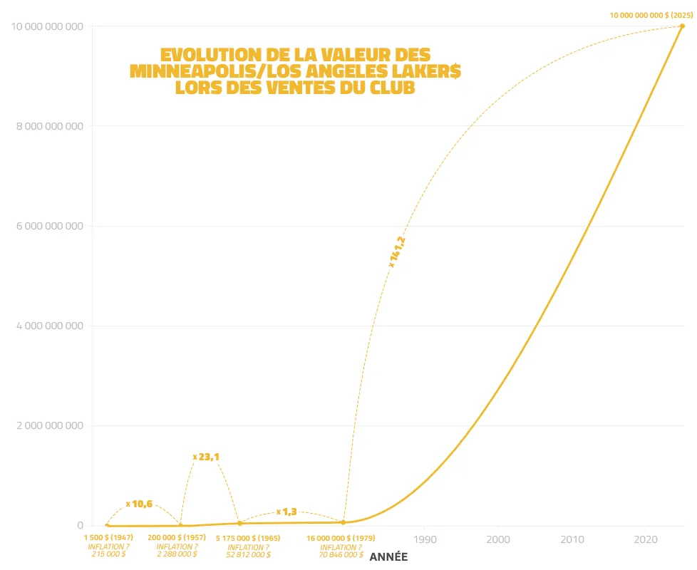 Surtout, l’évolution de la valeur des «Purple & Gold» a de quoi faire fantasmer. Lorsque Ben Berger et Morris Chalfen rachètent les Detroit Gems en 1947 pour les faire déménager à Minneapolis et les renommer les Lakers, ils n’ont à débourser que 15 000 dollars de l’époque. Avec l’inflation, cela fait 215 000 dollars à l’heure actuelle.