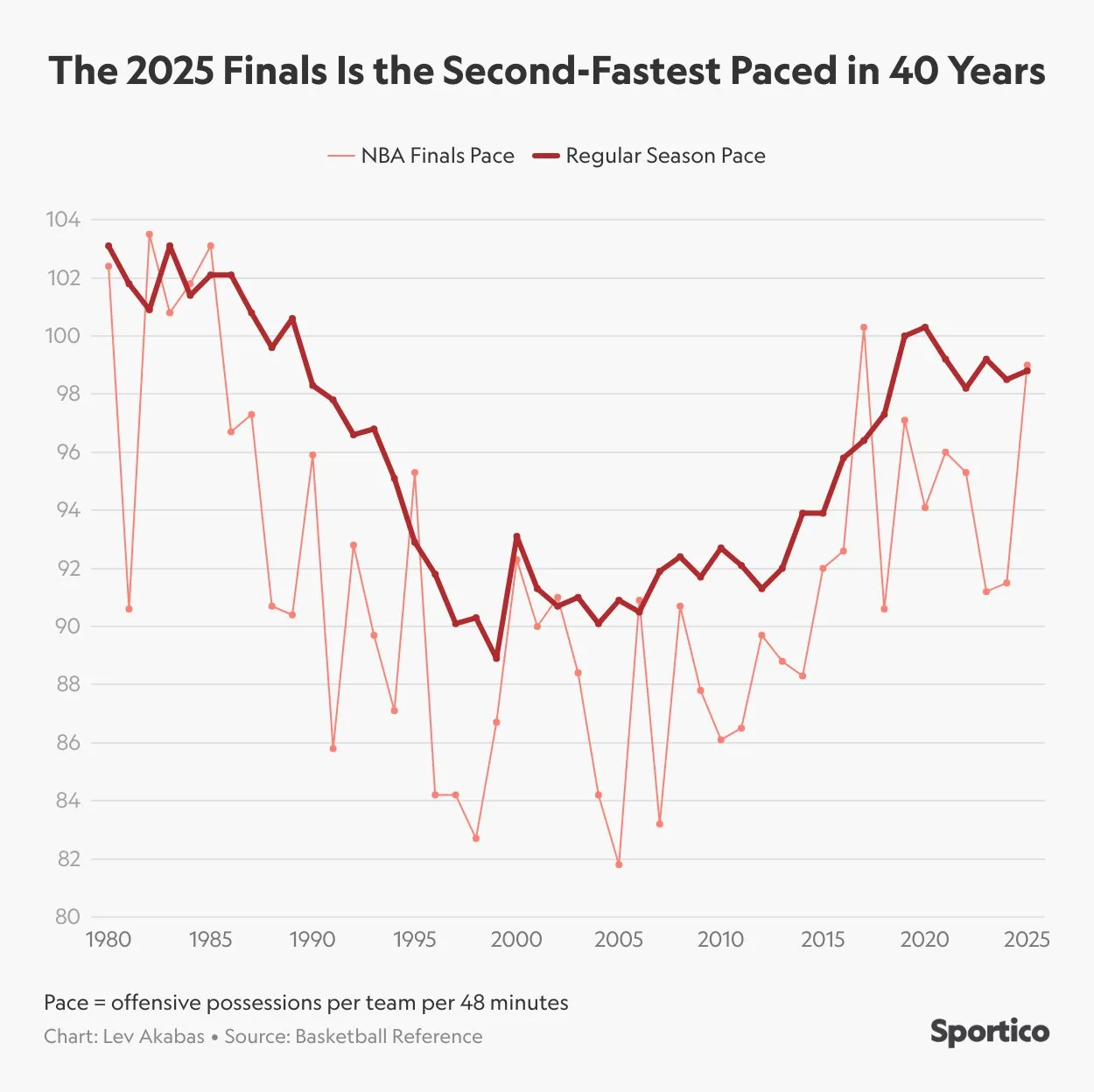 Ces Finals 2025 sont étonnantes à plus d’un titre, et notamment parce qu’on y joue plus vite qu’en saison régulière. Généralement, c’est l’inverse, le nombre de possessions ayant tendance à baisser en playoffs, et en finale.