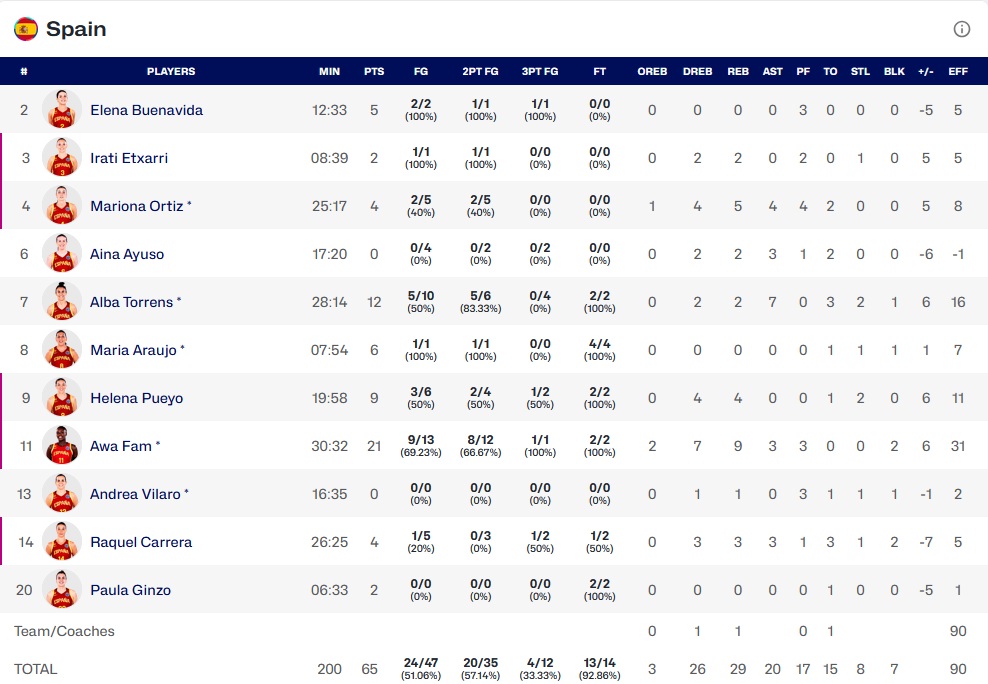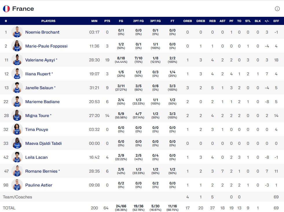 Il faut trois points pour aller en prolongation, Iliana Rupert a un bon tir, mais c’est manqué. La sortie de balle est en faveur de la France, les secondes s’égrènent et l’Espagne joue bien, en faisant faute. Romane Bernies marque le premier lancer, manque volontairement le deuxième et Iliana Rupert prend le rebond offensif et obtient le coup de sifflet. Malheureusement, après avoir marqué le premier, elle manque le second et l’Espagne s’impose 65-64.