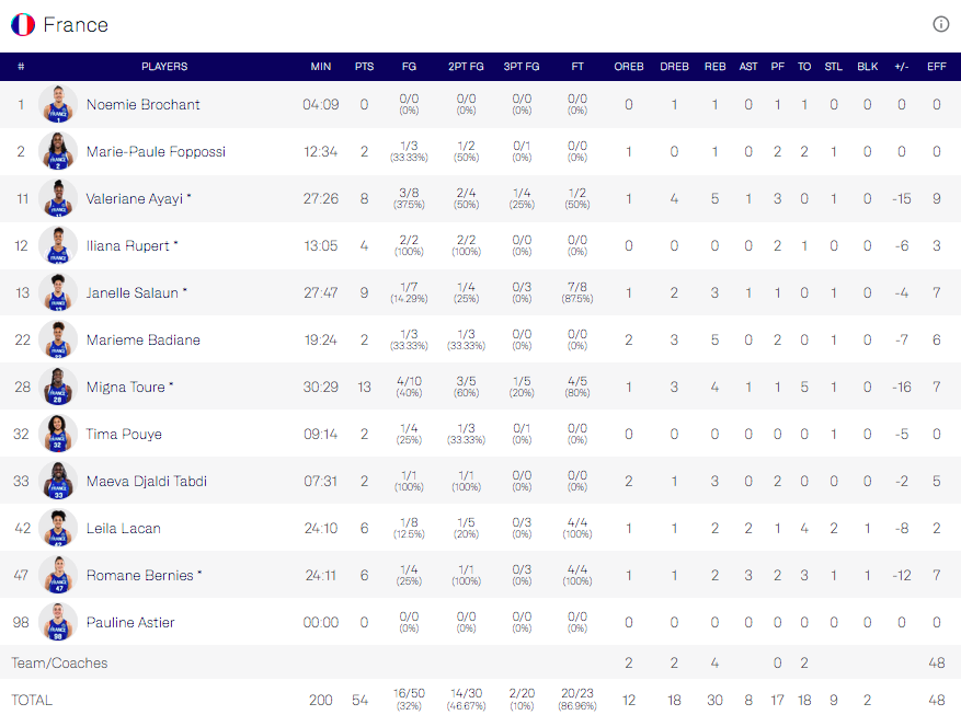 Les Bleues n’inscrivent ainsi que 18 points en deuxième mi-temps, en dévissant encore totalement à 3-points (2/20). Si confiante et brillante jusqu’aux quarts de finale, Janelle Salaün est violemment retombée sur terre lors des deux derniers matchs, et elle boucle cette petite finale avec 9 points à 1/7 au tir. Leïla Lacan (6 points à 1/8) a également souffert alors que les Bleues n’ont même quasiment jamais réussi à servir Iliana Rupert…