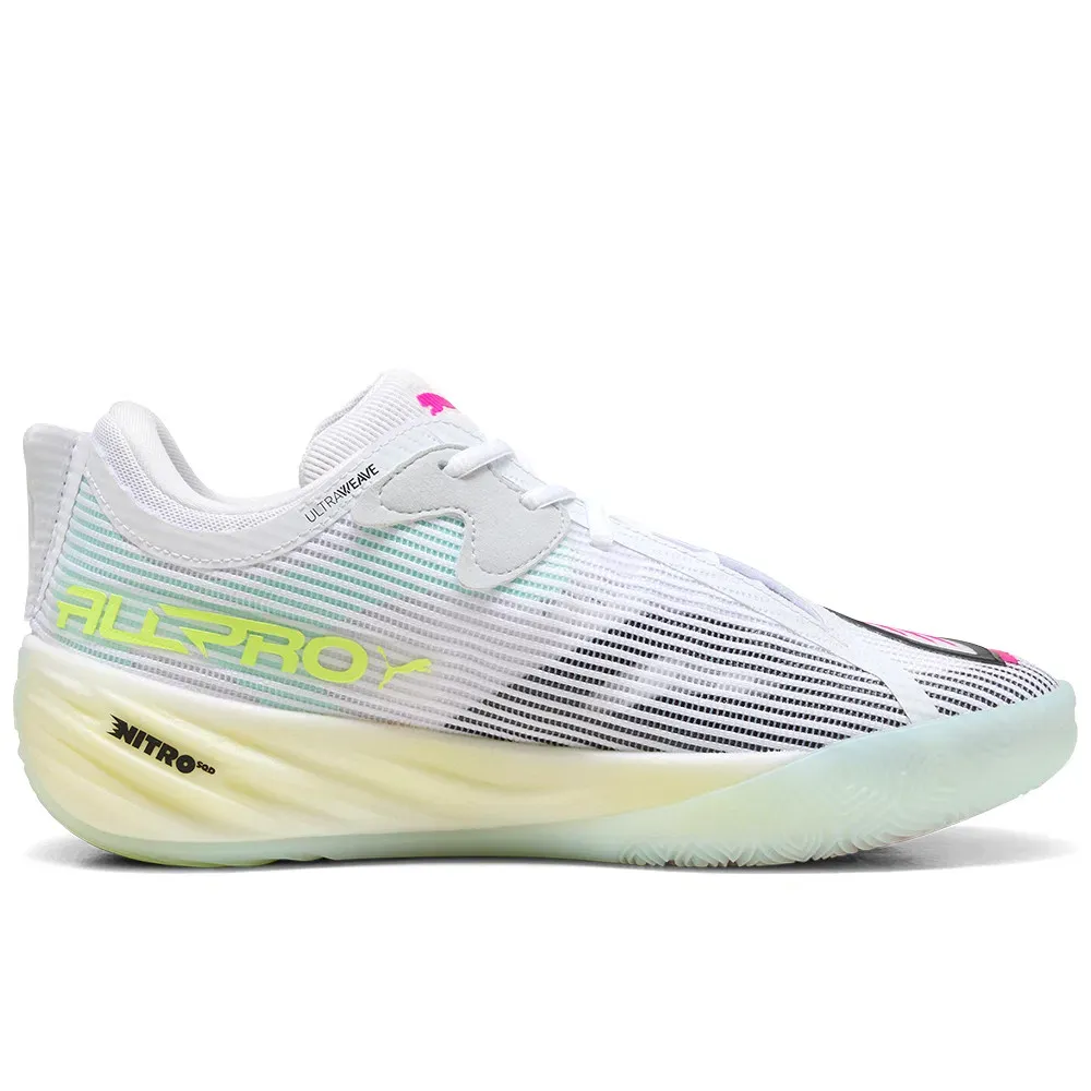 L’ensemble a en tout cas de quoi promettre beaucoup de bonnes choses pour les mois à venir, avec pour commencer ce premier coloris travaillé sur une base blanche et orné de touches en noir, rose, vert fluo et bleu pâle. La Puma All Pro Nitro 2 est disponible sur le site officiel de Puma au prix de 130 euros