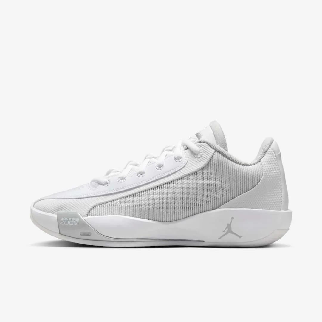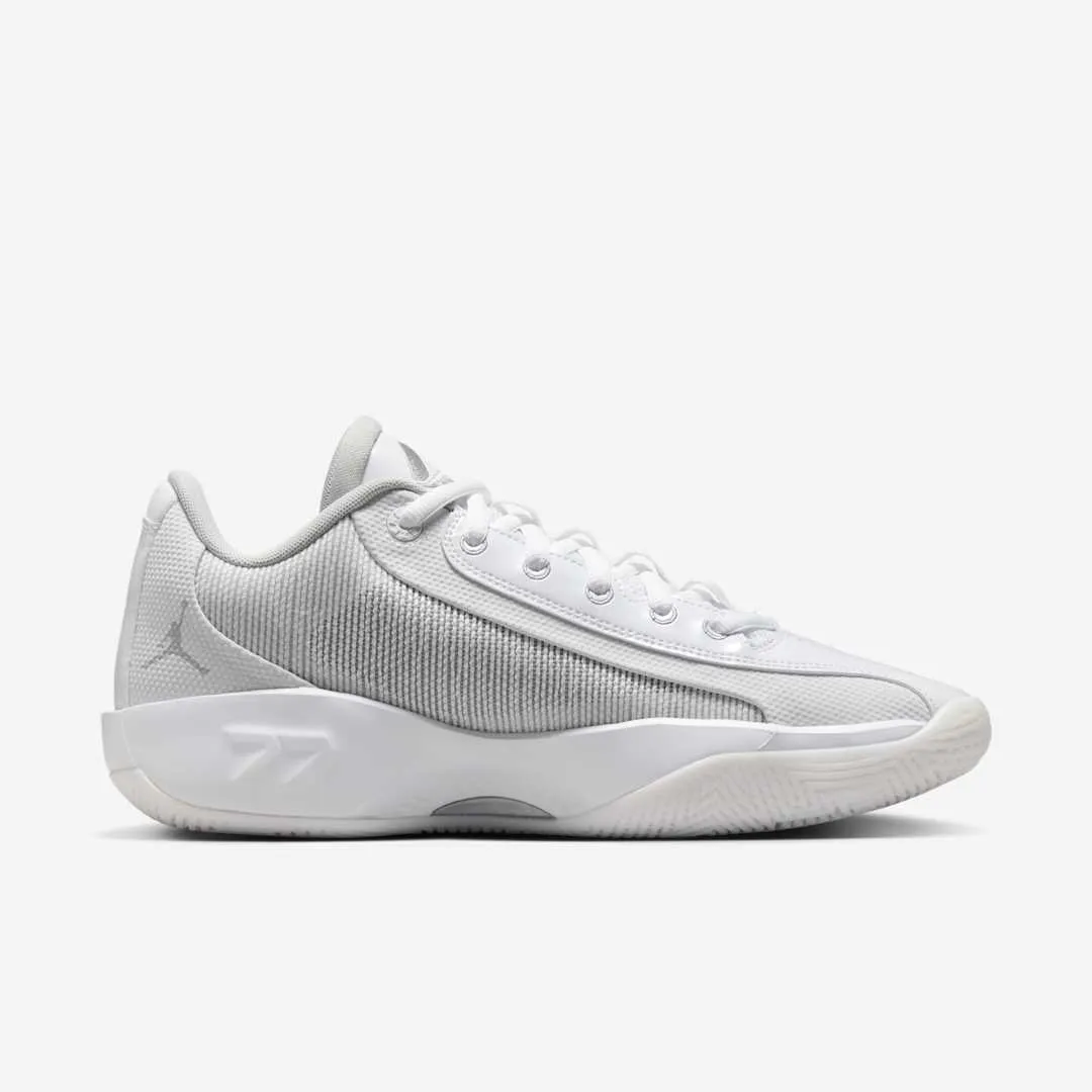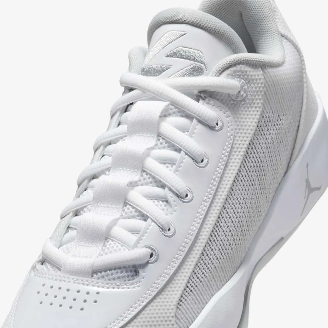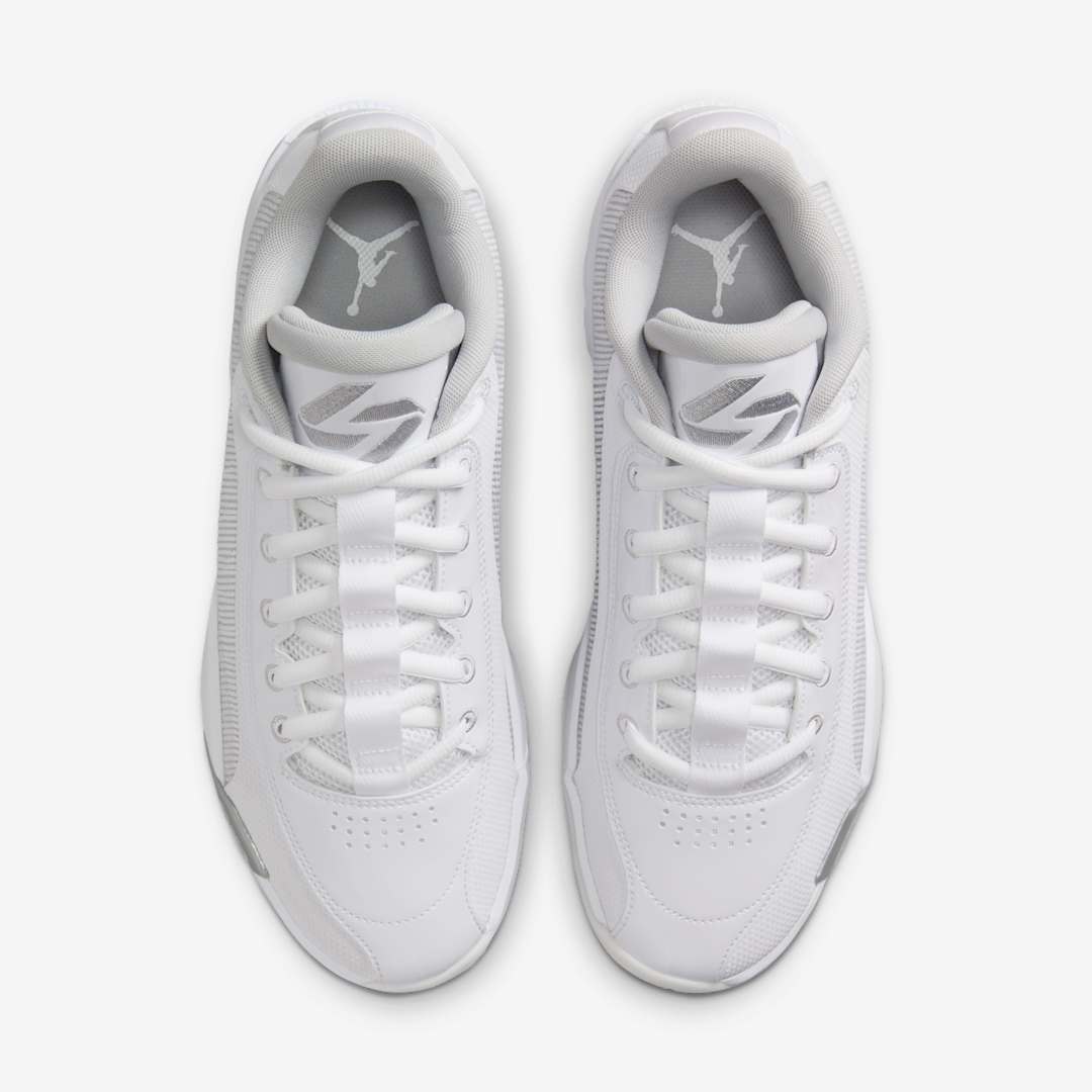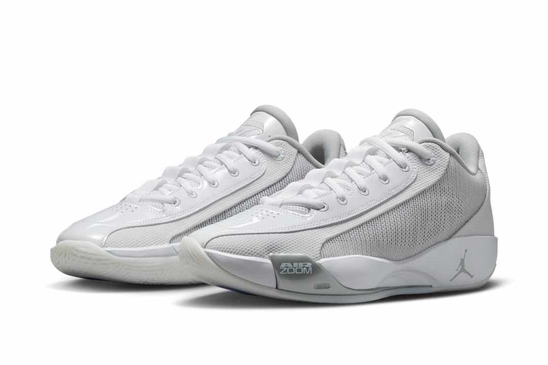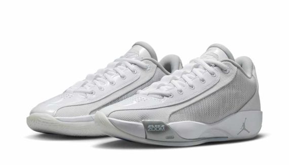 Le modèle se présente avec une tige blanche et des finitions en gris-argenté comme le logo du joueur sur la languette où les « Jumpman » sur la semelle et l’empeigne. Un cœur rouge ressorte également à l’intérieur de la languette.