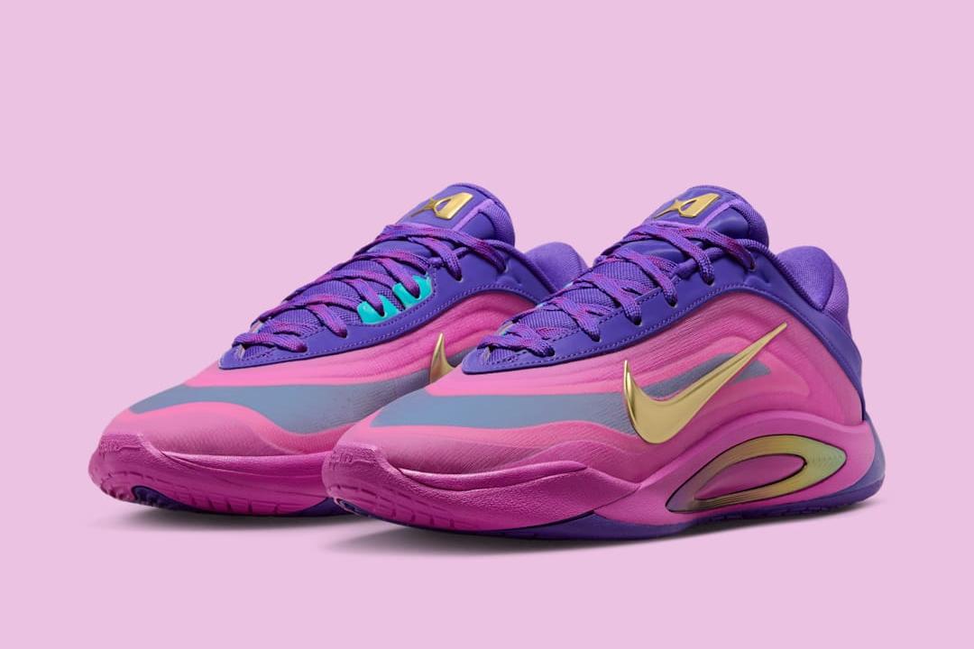 La base de la tige en rose est traversée d’une bande grise et contrastée par un« Swoosh » doré sur l’empeigne. La partie supérieure du modèle ressort en violet, avec une touche de bleu ciel sur deux œillets. La Nike A’One veut s’ériger en référence en termes d’amorti, d’adhérence et de maintien, le tout à un prix « abordable ».