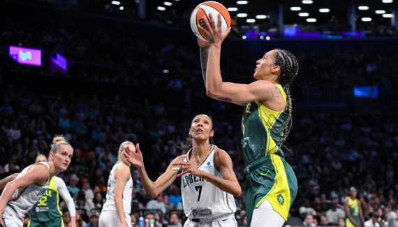 Seattle a d’abord fait mieux que résister en première mi-temps, avec l’appui de Skylar Diggins et de la paire intérieure Magbegor-Ogwumike pour bien débuter la partie (18-22). Malgré les efforts de Gabby Williams et ses coéquipières, c’est tout de même New York qui a viré en tête à l’heure du repos, et ce, grâce aux exploits répétés de Sabrina Ionescu, déjà à 20 points à la pause, à 5/6 de loin ! L’arrière shooteuse a notamment conclu la première mi-temps par un 3+1 qui a enflammé le Barclays Center, permettant aux New Yorkaises de rentrer au vestiaire à +3 (44-41).