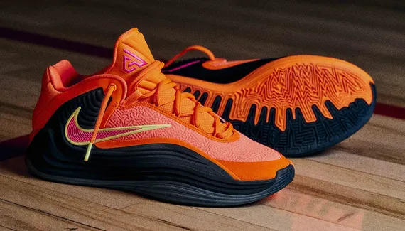 La Nike Giannis Freak 7 « Ignition » en orange, noir et gris. Le logo du joueur ressort en rose sur la languette, tout comme le « Swoosh » sur l’empeigne, assorti de contours en doré.
