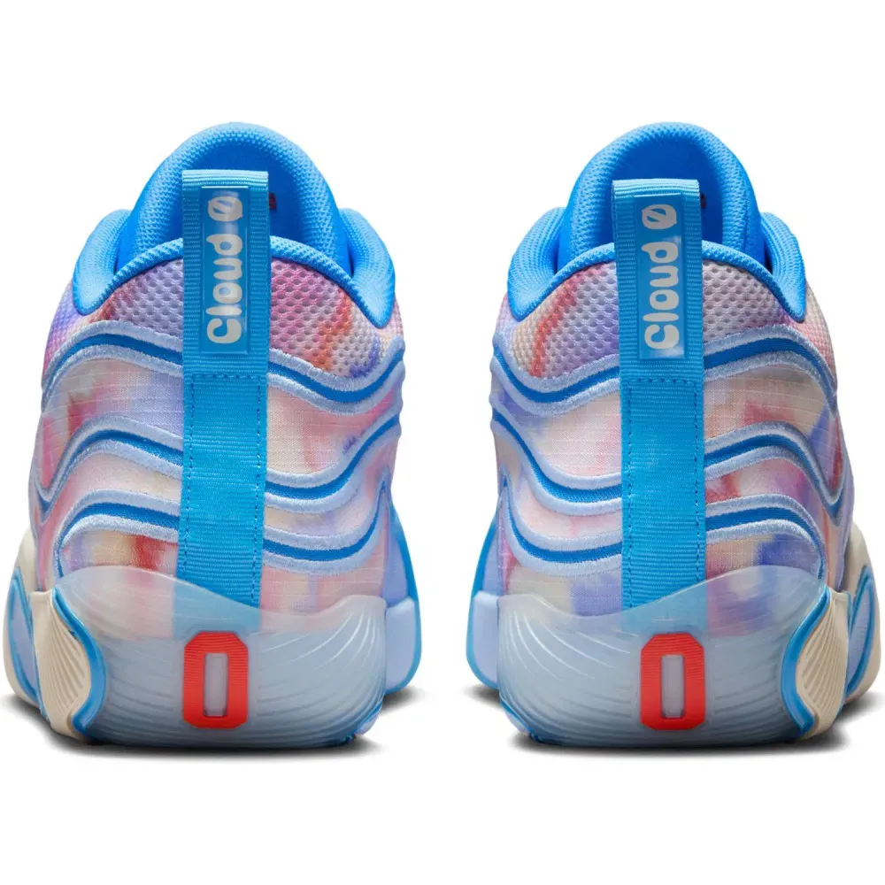 S’agissant de la Jordan Tatum 3, voici un neuvième coloris « Tie Dye » pour essayer de maintenir la troisième chaussure signature de l’ailier des Celtics sur le devant de la scène. La paire est donc recouverte de motifs « Tie Dye » assortis de finitions en bleu et orange, notamment pour faire ressortir le « Jumpman » et le logo « JT » présent sur la languette. Sur le talon, on retrouve également en blanc l’inscription « Cloud 0 » sur la tirette ainsi que le numéro 0 en orange.