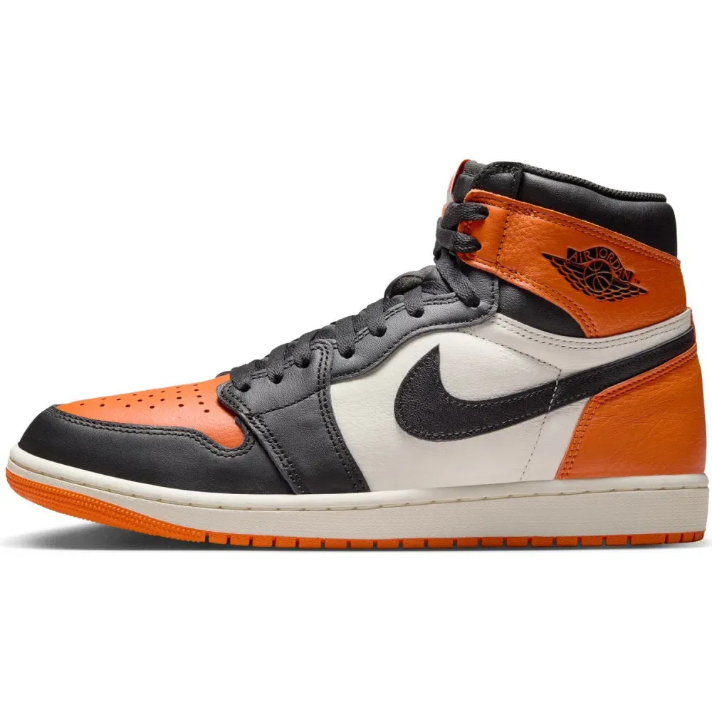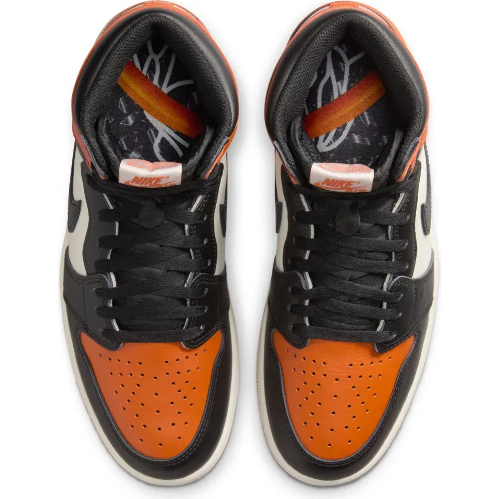 Lors de cette rencontre, Jordan portait un maillot orange et noir, ainsi qu'une paire de Air Jordan 1. Ces souvenirs sont concentrés dans ce coloris de cette Air Jordan 1, composée de superpositions de cuir entre noir, orange et blanc.