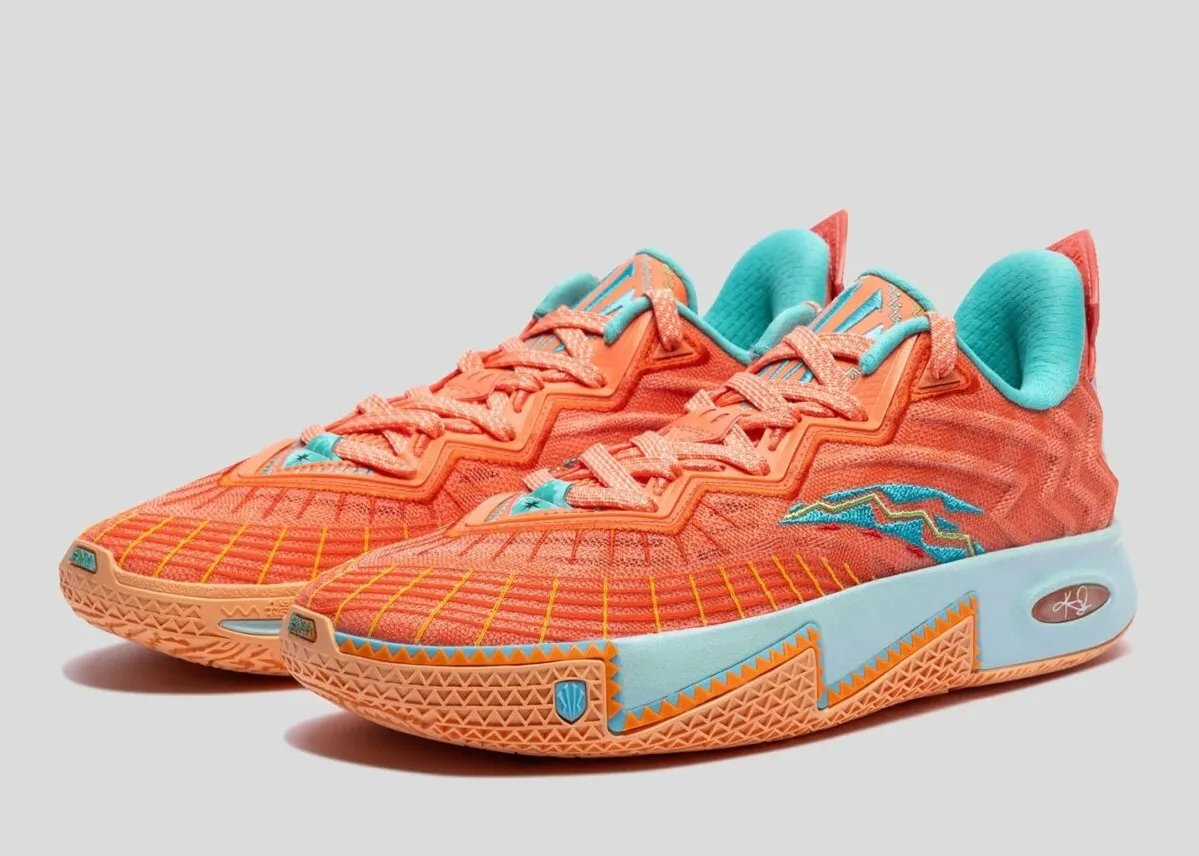 Le meneur des Mavs venait de présenter son nouveau modèle lors du All-Star Game, avec un premier coloris « Artist on Court » des plus originaux. Anta Sports a cette fois sorti un nouveau coloris « Sun » aux couleurs de l’été, en orange assorti de touches bleu ciel, pour habiller le col, une partie de la semelle intermédiaire, et faire ressortir le logo du joueur sur la languette. On note aussi quelques finitions en jaune sur l’empeigne et un talon en violet et noir.