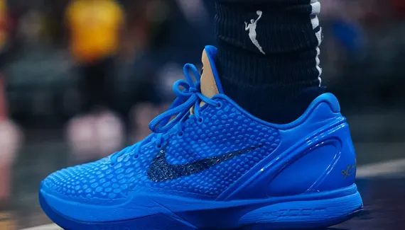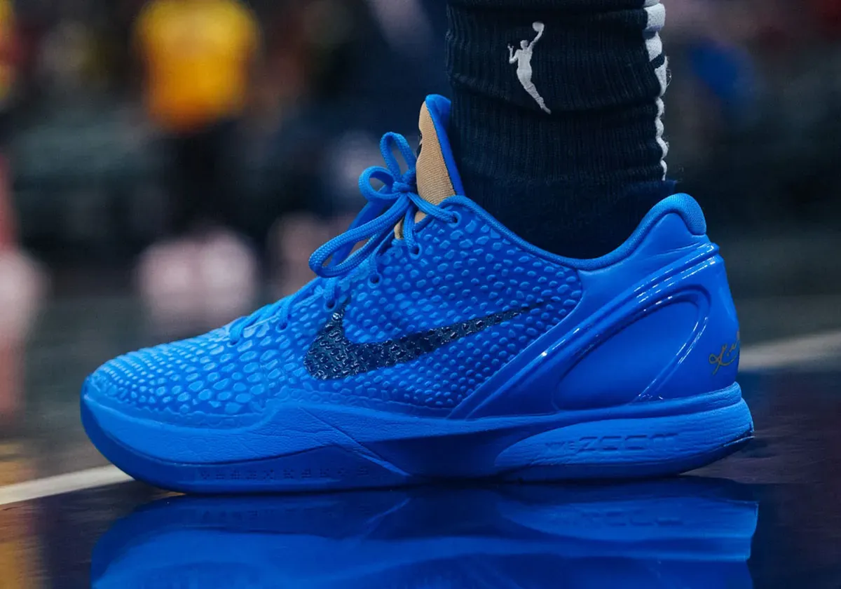 La tige et la semelle entièrement en bleu foncé font leur effet, le tout étant contrasté par un « Swoosh » noir sur l'empeigne et une languette en marron clair, couleur cookie. Pour sa première sortie avec cette Kobe 6 « Cookie Monster », Caitlin Clark n'a pas manqué de faire le spectacle en compilant 14 points, 13 passes décisives et 5 interceptions.