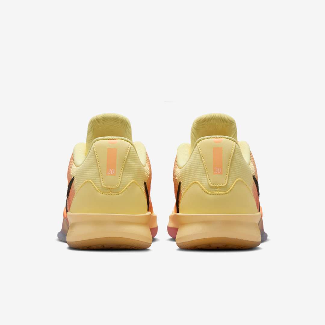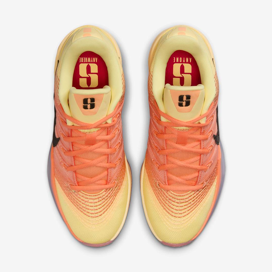 La paire emprunte des couleurs estivales entre jaune et orange avec des finitions en noir. La touche de style apparaît notamment sur le « Swoosh » latéral noir en daim, ou sur la languette, sur laquelle figure le « S » de la shooteuse du New York Liberty.