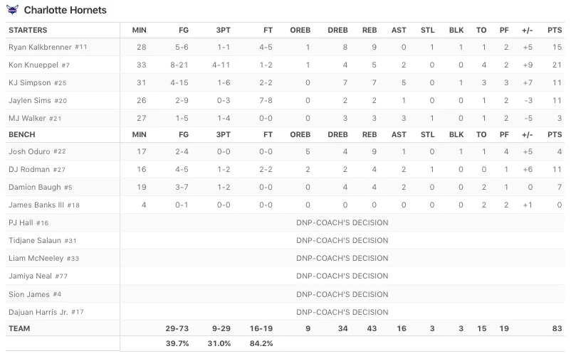 Ce dernier (9 points, 7 rebonds), s’est mis en valeur en début de match avec son main-à-main à la Domantas Sabonis pour libérer Nique Clifford. Néanmoins, le duo Kon Knueppel – Ryan Kalkbrenner a fait très mal à Sacramento, permettant aux Hornets de prendre le large après un quart-temps.