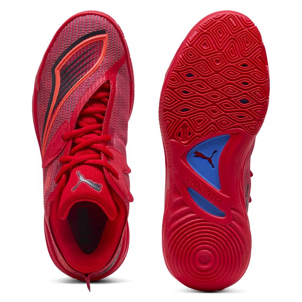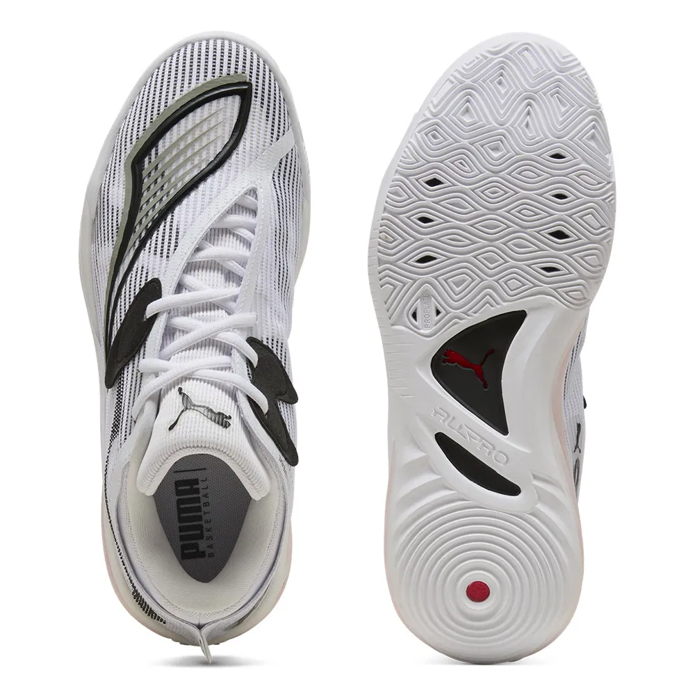 Enfin, on peut noter pou innovation la disposition et la coupe de la languette, avec des lacets censés offrir le meilleur maintien du pied. Niveau design également, le logo « Puma Stripe » apparaît avec un effet 3D sur l’avant du pied et vient compléter l’inscription « All-Pro » ici en vert fluo sur l’empeigne.