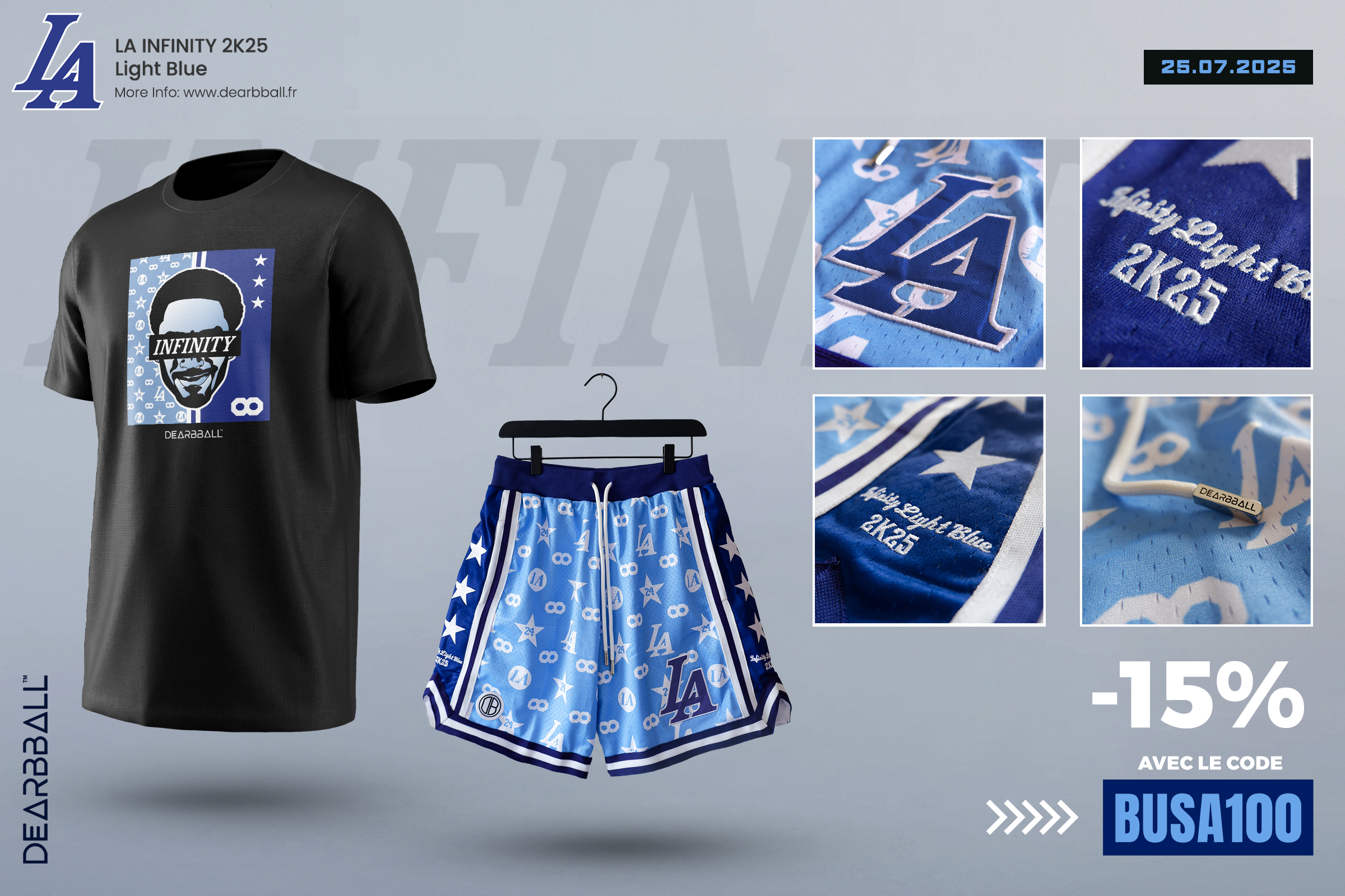 Quatre ans après avoir fait exploser les compteurs avec son mythique short Los Angeles Infinity Blue, DearBBall revient avec un modèle qui risque, encore une fois, de disparaître en quelques minutes. Son nom ? Infinity Light Blue. Son style ? Légendaire. Sa disponibilité ? Ultra-limitée.