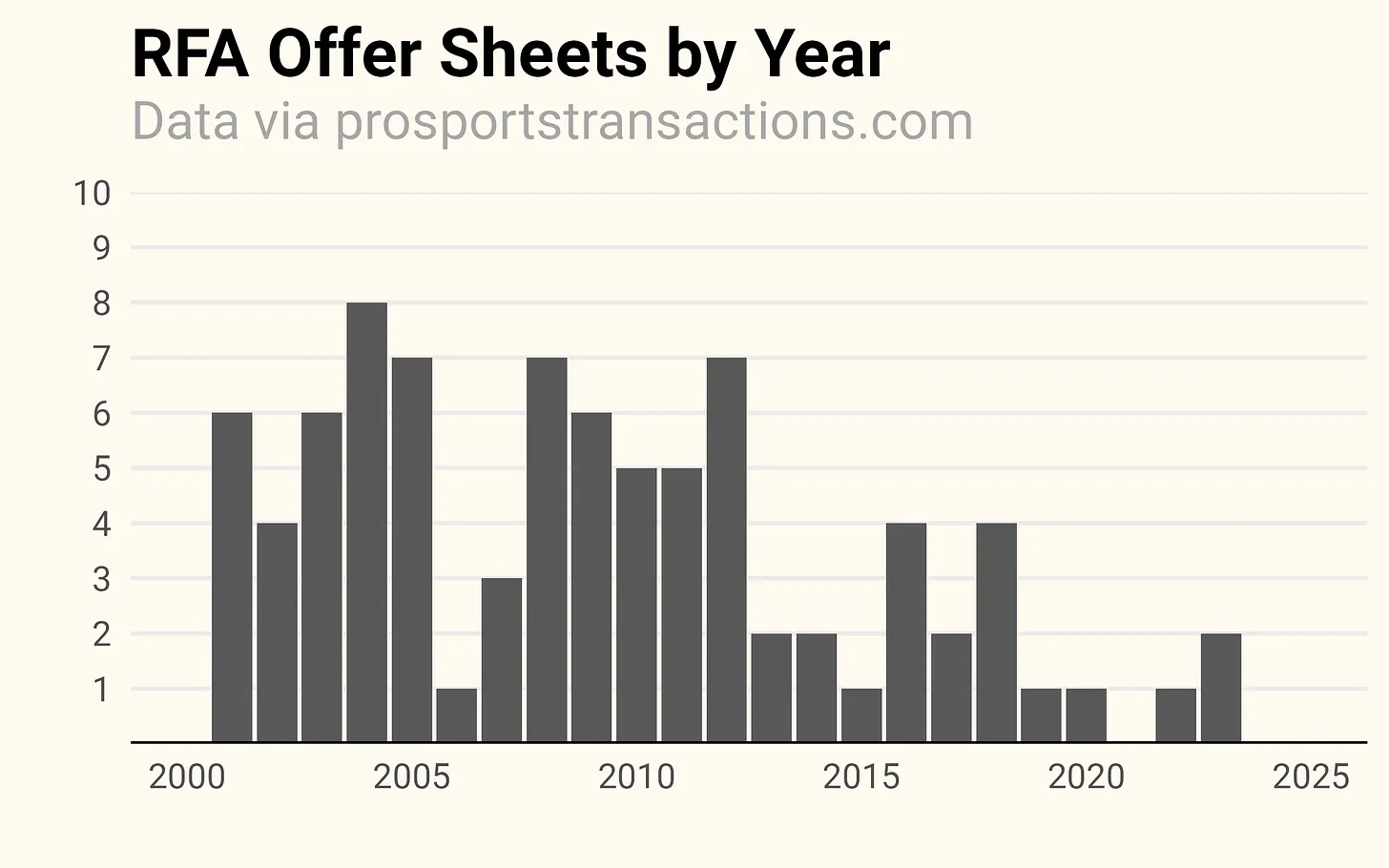 Comme les clubs NBA prolongent désormais leurs joueurs, préférant échanger les contrats plutôt que de dégager de la masse salariale pour attirer des « free agents », l’effet de levier n’existe plus pour les joueurs qui arrivent à la fin de leur contrat rookie. Ainsi, aucun « free agent » protégé n’a même reçu d’offre ces deux derniers étés…