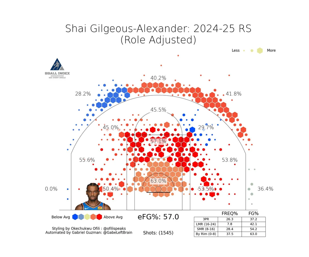 Dans une NBA toujours plus tournée vers le tir à 3-points, Shai Gilgeous-Alexander domine lui surtout par son jeu à mi-distance. Un choix judicieux puisque la star du Thunder a réalisé une saison extraordinaire où il a été élu MVP et MVP des Finals, tout en remportant le titre NBA.