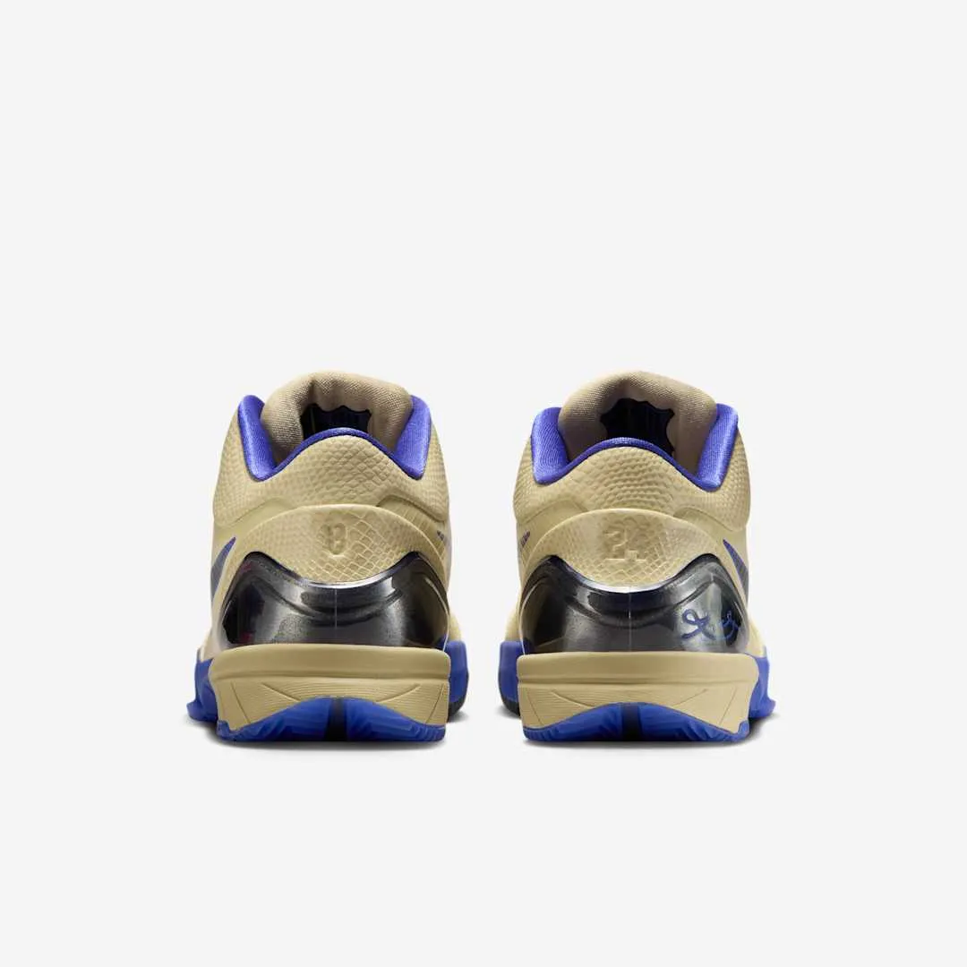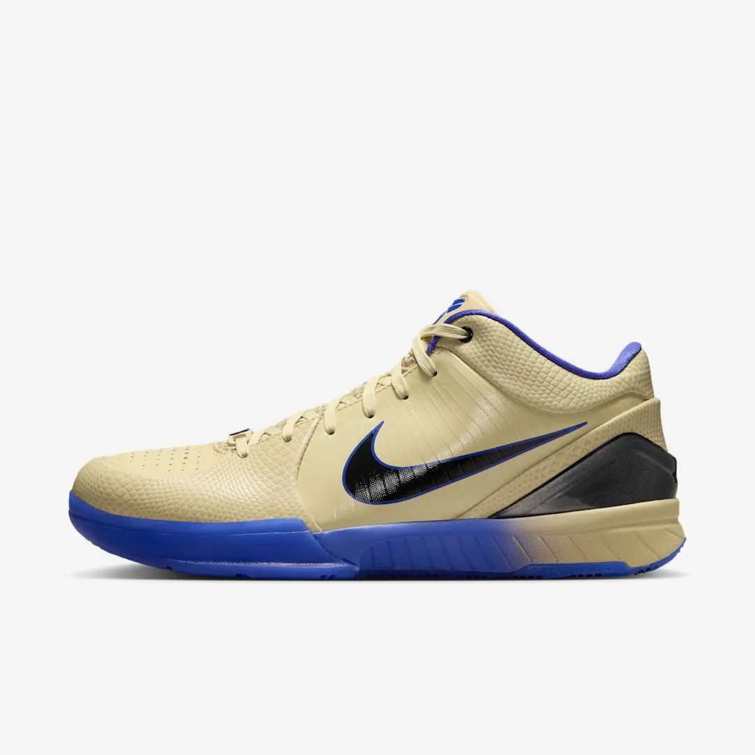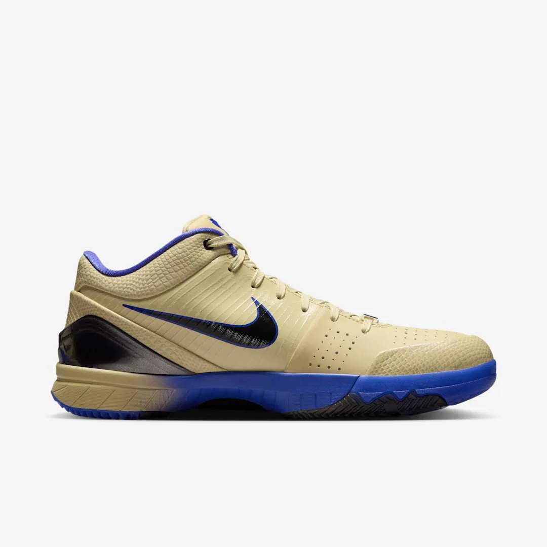 Nike a donc vu juste, concoctant en prime le même coloris pour la Kobe 4, principalement avec le même jaune pâle sur une tige soignée, assortie de motifs peau de serpent, avec du bleu marine, et des finitions en noir, comme sur le « Swoosh » latéral. Pas de rouge donc pour compléter le tout, mais trois écussons du Barça en noir et bleu, au niveau des lacets, à l'intérieur de la languette et sur la semelle de propreté.