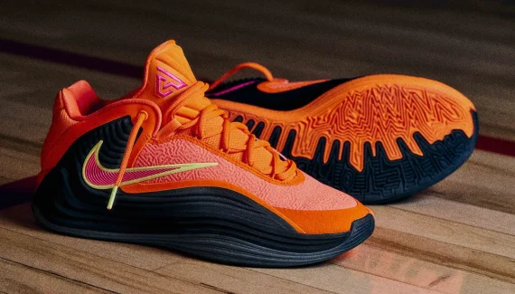 Enfin, on notera le travail remarquable effectué sur la semelle avec l’inscription “Antetokounmpo” qui apparaît sur les motifs du revêtement extérieur. Ce premier coloris « Ignition » oscille en orange et noir. Le logo du joueur ressort en rose sur la languette, tout comme le « Swoosh » sur l’empeigne, assorti de contours dorés.