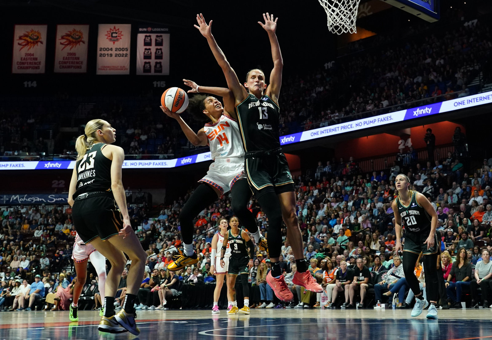Dès le début du deuxième acte, le Sun recolle à deux longueurs grâce à quatre points consécutifs de Leila Lacan (4 points, 3 interceptions). Si New York tente de creuser à nouveau l’écart, Bria Hartley (12 points, 4 passes) ramène Connecticut à une possession (39-36). Néanmoins, après un temps-mort de Sandy Brondello, le Liberty passe un 6-2 pour finir la première mi-temps, toujours porté par Sabrina Ionescu qui affiche 20 points à 9/14 au tir au moment de rejoindre les vestiaires (45-38).