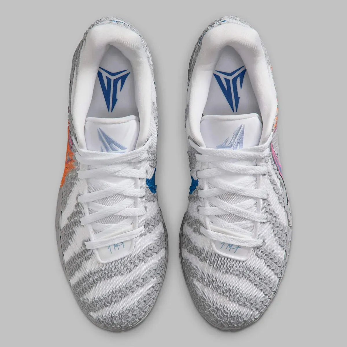 Le tout premier coloris de la Nike Ja 3 est donc ce “Sound Check” dont les premiers clichés officiels ont été dévoilés lunjdi, avec une base en blanc et gris assortie de motifs en orange et violet pour faire ressortir le « A » en style graffiti et des « Swoosh » en bleu dont l'un affiche des contours en rose.