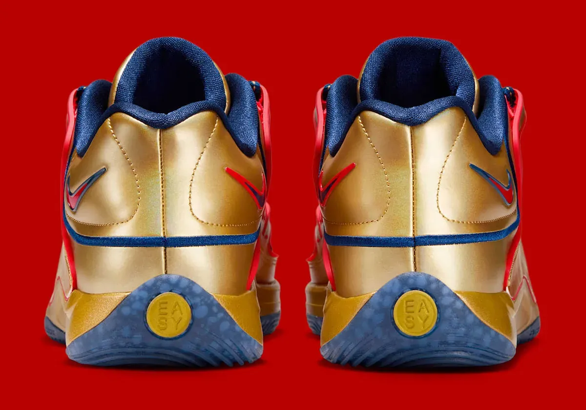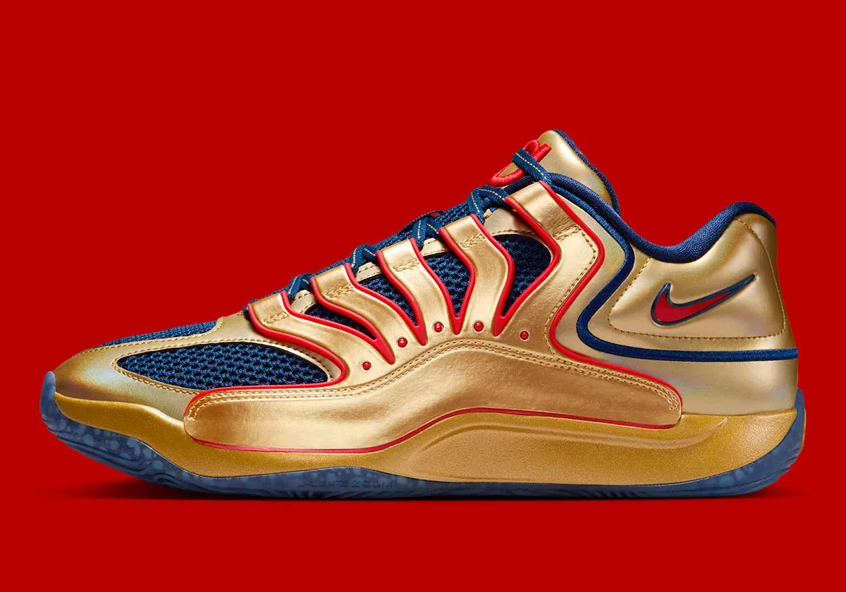 Treize ans et trois médailles d’or plus tard, voici un coloris « Immortalized » de la KD 18 qui porte les mêmes couleurs, avec une base en bleu marine et des finitions en rouge rappelant le drapeau américain, et donc un complément doré sur la tige et la semelle intermédiaire.