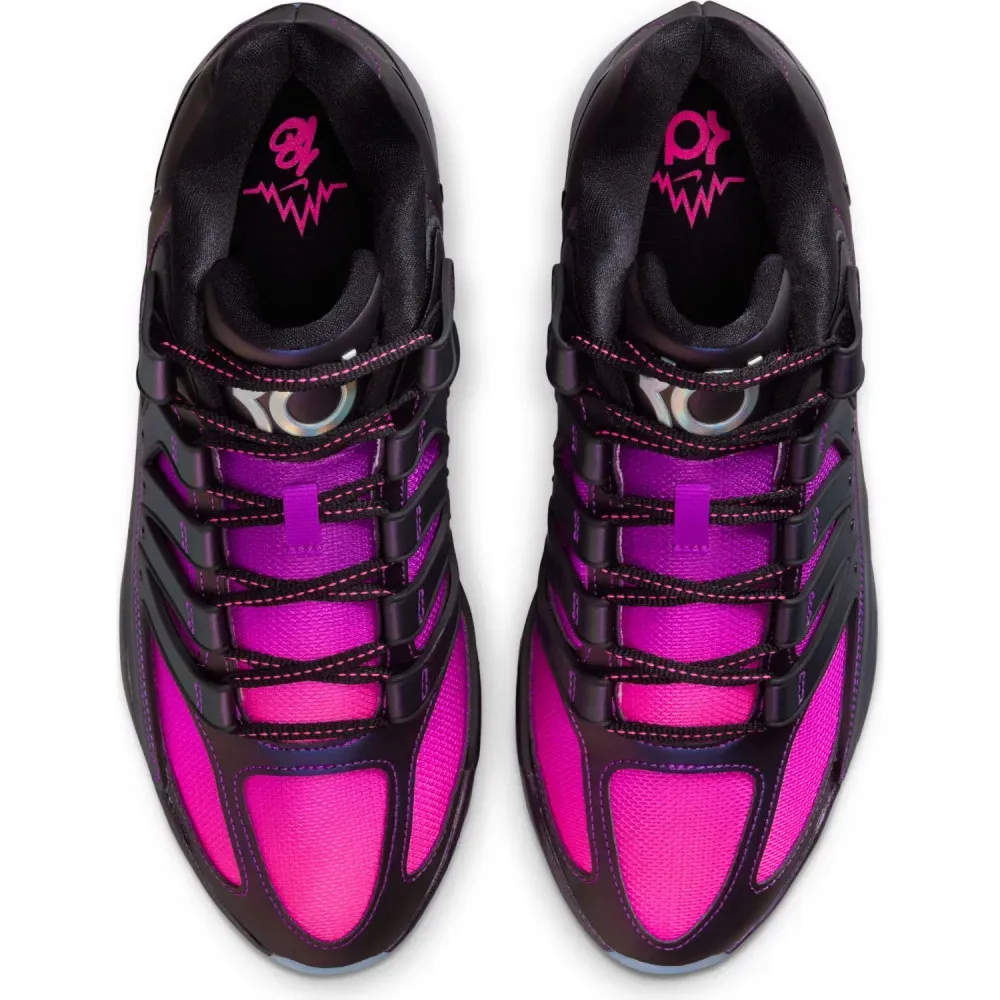 La KD 18 est aussi au rendez-vous cet été avec un nouveau coloris « Vivid Purple » de circonstance. La tige emprunte des tons entre violet et rose sous forme de dégradé, comme pour illustrer un coucher de soleil estival. Le « Swoosh » et le logo du joueur sur la languette contrastent l’ensemble dans un style argenté, tandis que l’ensemble repose sur une semelle extérieure translucide.