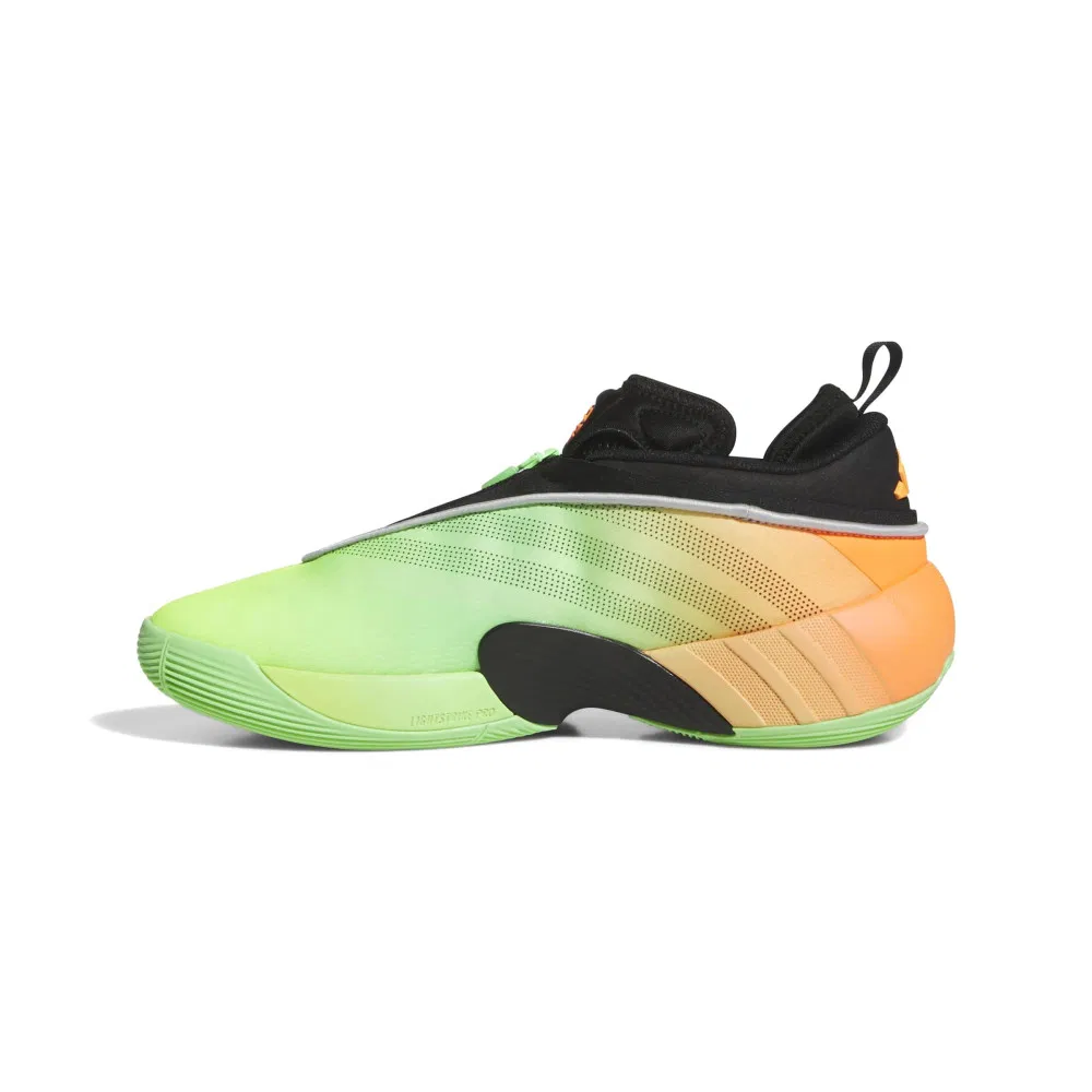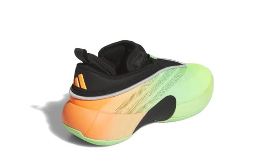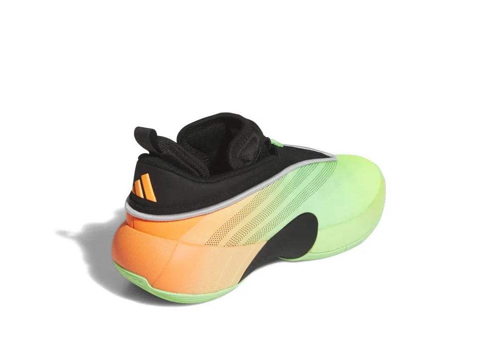 Pour ce deuxième coloris “Panama”, on reste sur du “flashy” avec une tige qui passe du vert à l’orange. Séparée par une bande grise, la partie supérieure ressort en noir et permet de mettre en lumière en orange les logos adidas sur le talon et celui du joueur sur la languette, le fameux “Spida”.