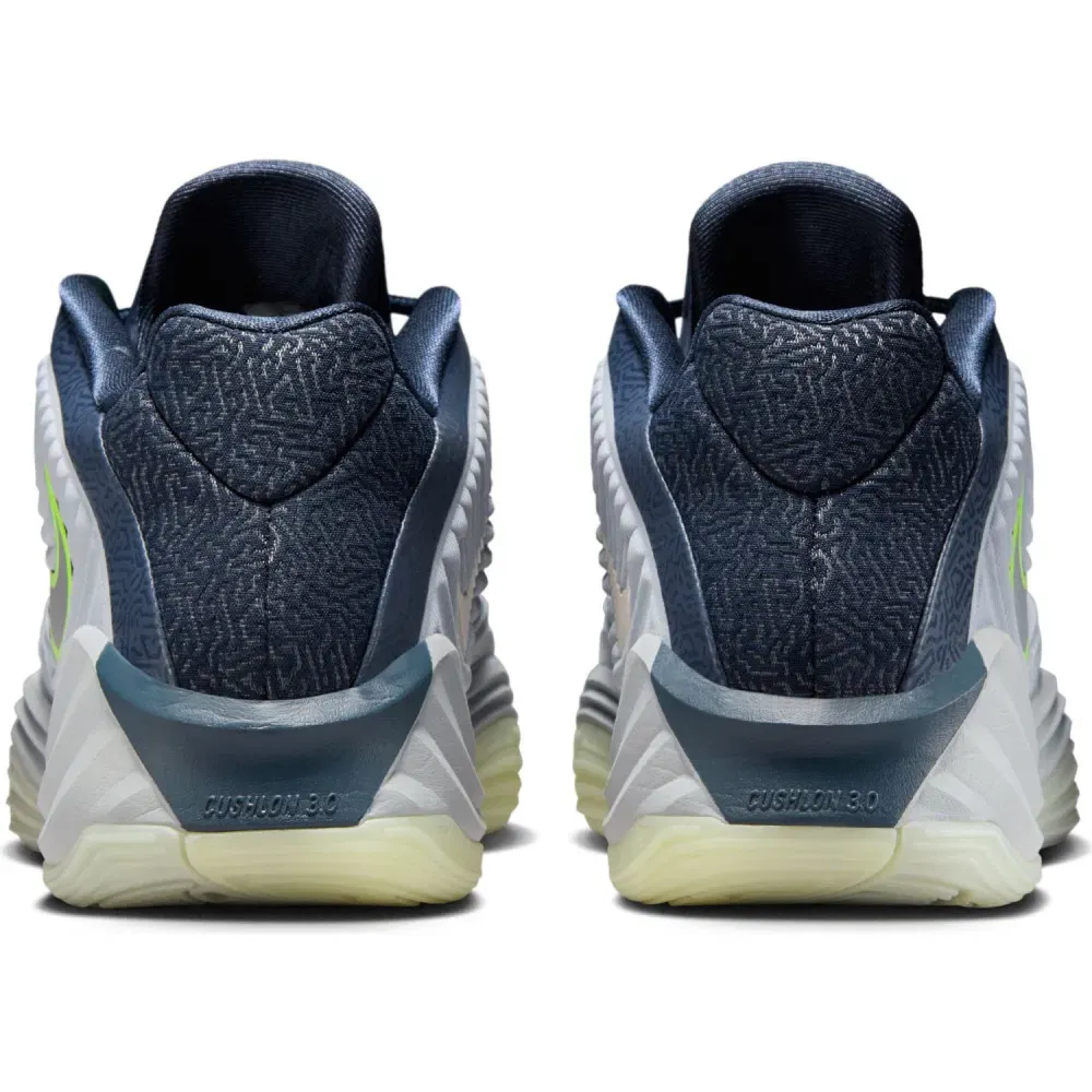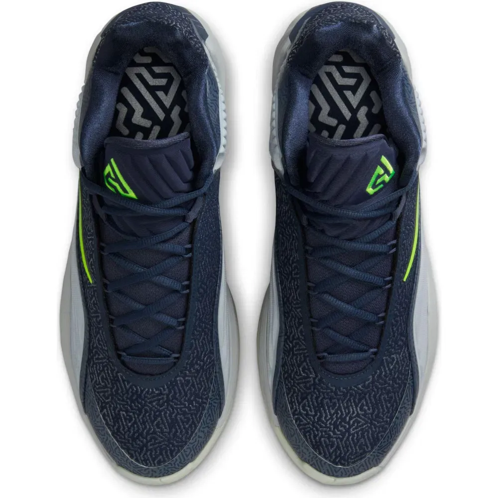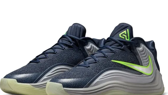 Sortie fin juillet avec un premier coloris « Ignition », la voilà de retour dans des tons plus sombres avec une tige entre bleu marine et gris, avec du vert fluo en guise de finitions, sur les contours du « Swoosh » inversé ou pour faire ressortir le logo du joueur sur la languette. La semelle, sous laquelle l’inscription “Antetokounmpo” apparaît sur les motifs du revêtement extérieur, complète l’ensemble entre gris et blanc nacré.