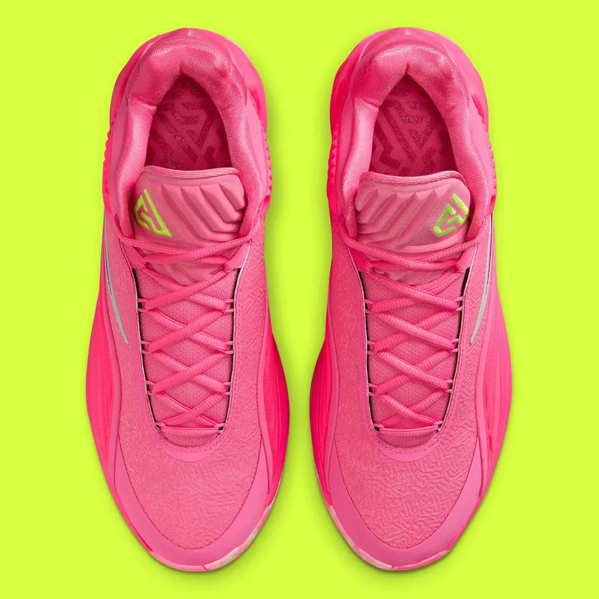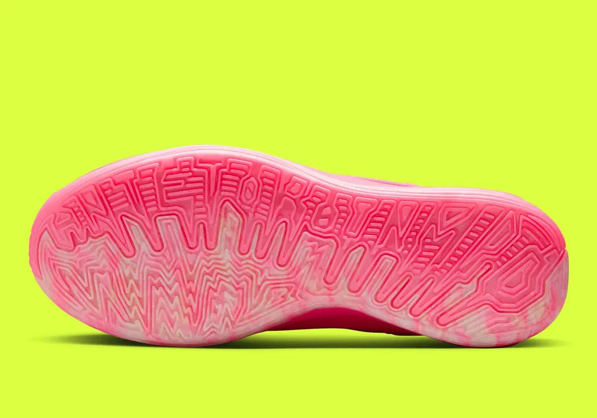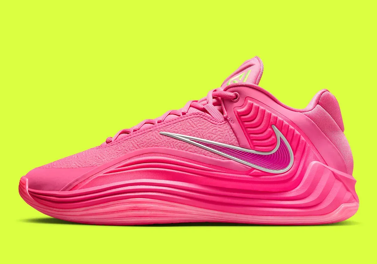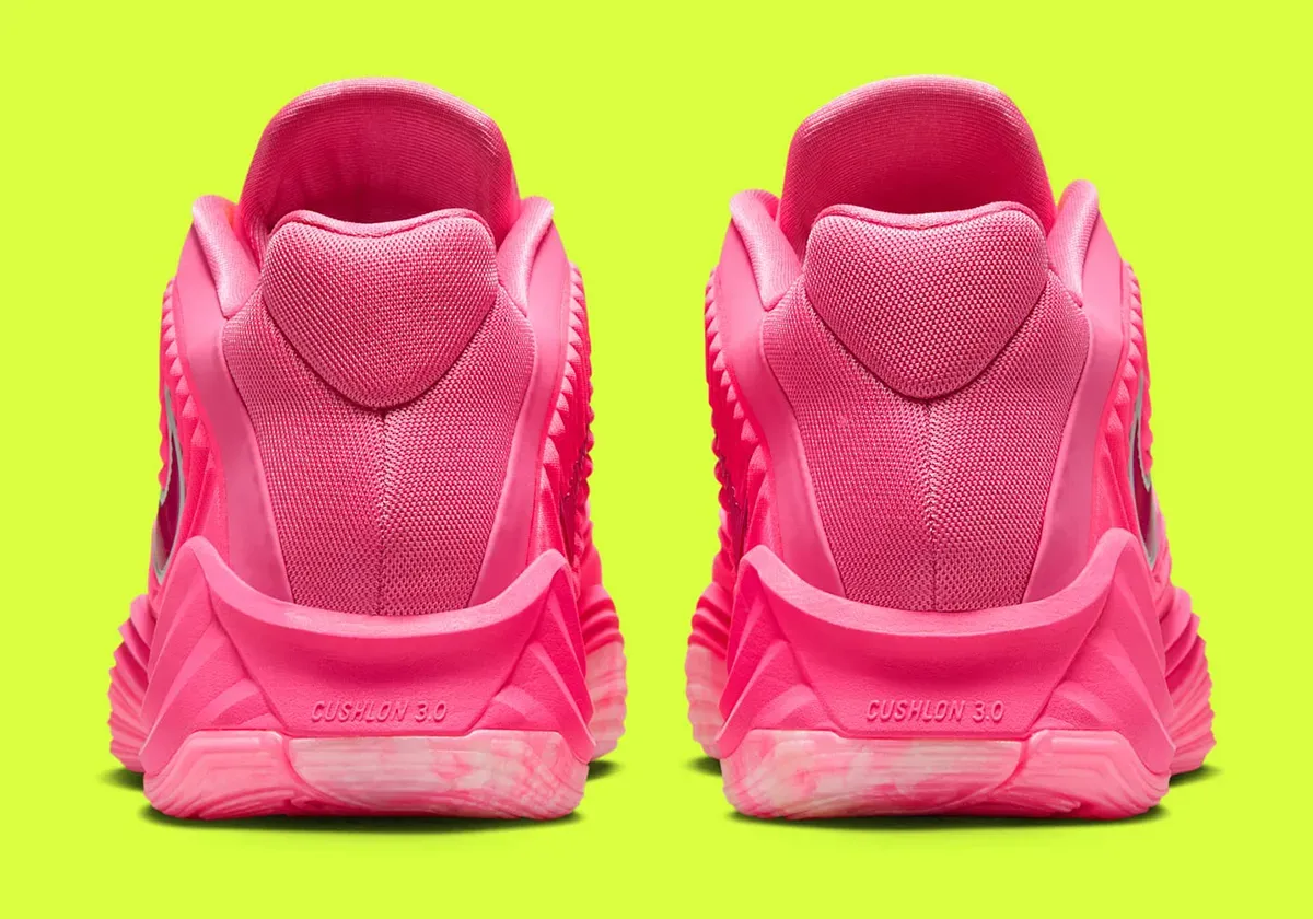 Après le coloris « Night Shift » jeudi, c’est au tour du coloris « Live Wire » de compléter la collection La marque à la virgule a cette fois opté pour une tige principalement rose, avec un « Swoosh » inversé violet aux contours gris et le logo de la superstar des Bucks en vert fluo sur la languette. Le tout lui donne un côté “panthère rose” qui ne passera pas inaperçu.