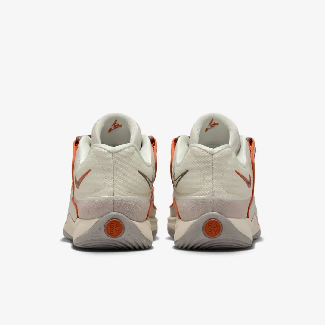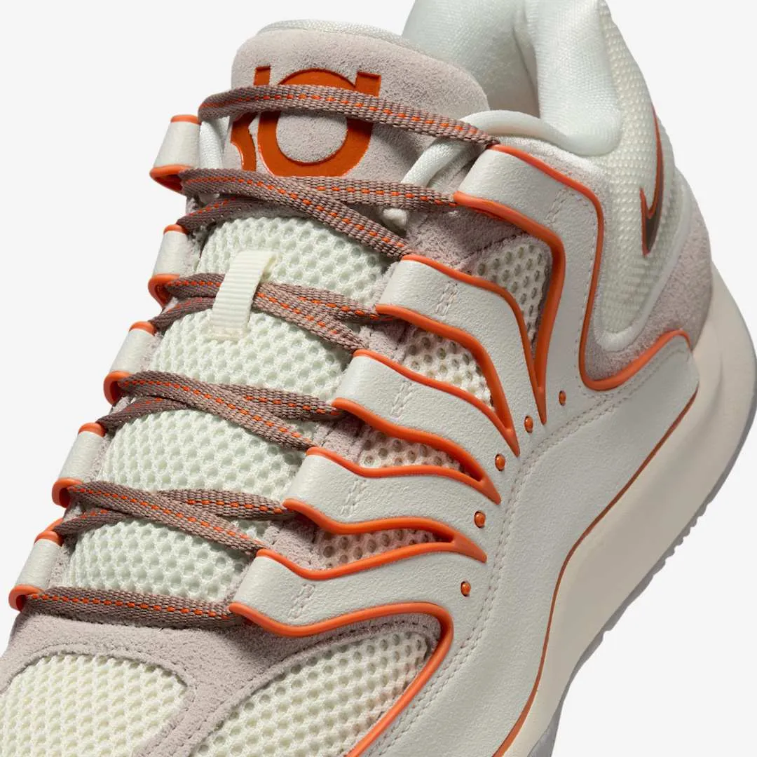 La 18e chaussure signature de Kevin Durant se présente ici avec une tige entre blanc, marron et beige, dotée de finitions en orange pour se rapprocher du style Texas Longhorns, où KD est passé avant d’intégrer la NBA. Le logo de KD sur la languette et les contours du Swoosh ressortent également en orange.