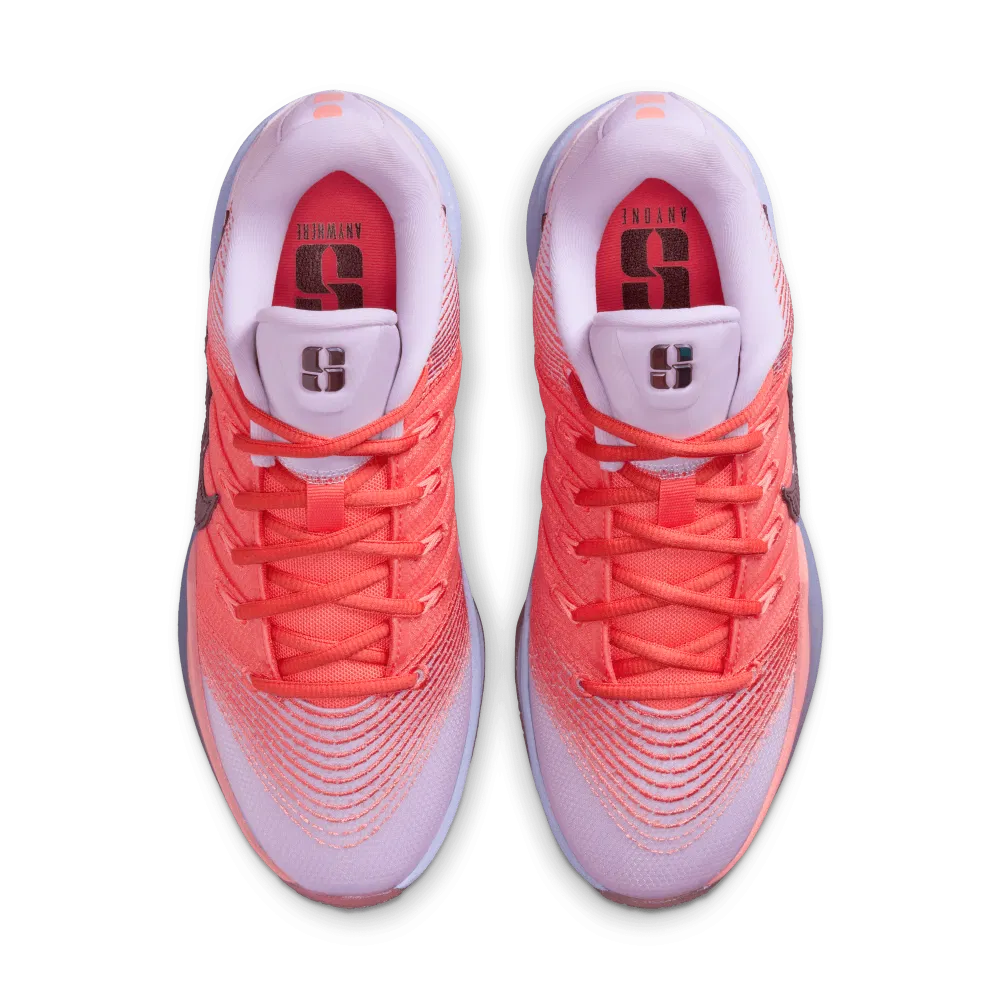 La paire se présente avec une partie orange au milieu, où figurent les câbles Flywire qui servent aussi d'œillets, et violet sur les extrémités. Le « Swoosh » sur l'empeigne et le logo de la shooteuse de New York apparaissent en noir. La semelle intermédiaire est pour sa part équipée de mousse Cushlon et d'un amorti « Zoom Air » sous l'avant du pied.
