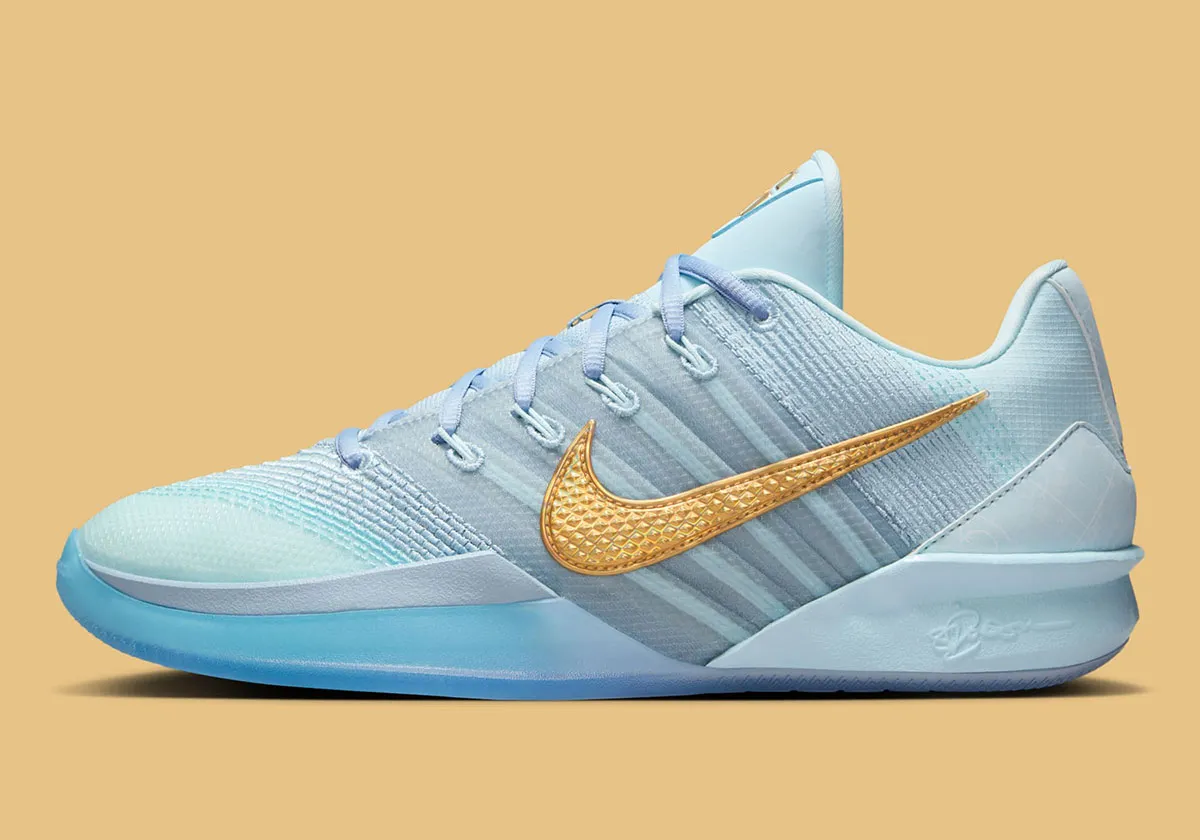 La tige opte pour différents tons de bleu clair, laissant présager un clin d’œil aux couleurs du Liberty, avec pour finitions de logo de la joueuse sur la languette et le « Swoosh » latéral ressortant en doré. La semelle garde quant à elle une unité Zoom Air à l’avant du pied et une mousse Cushlon en complément intermédiaire.