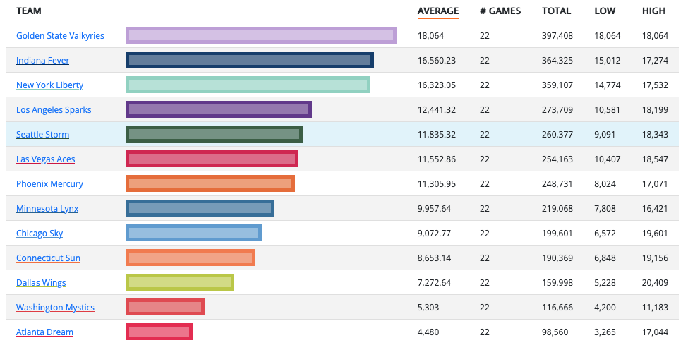 Néanmoins, la WNBA a aussi battu son record de spectateurs par match (10 986), devant la saison 1998 (10 868), grâce notamment à l’arrivée dans le paysage des Golden State Valkyries de Janelle Salaün et Iliana Rupert, qui ont joué toutes leurs rencontres au Chase Center à guichets fermés, soit 18 064 fans présents par match.