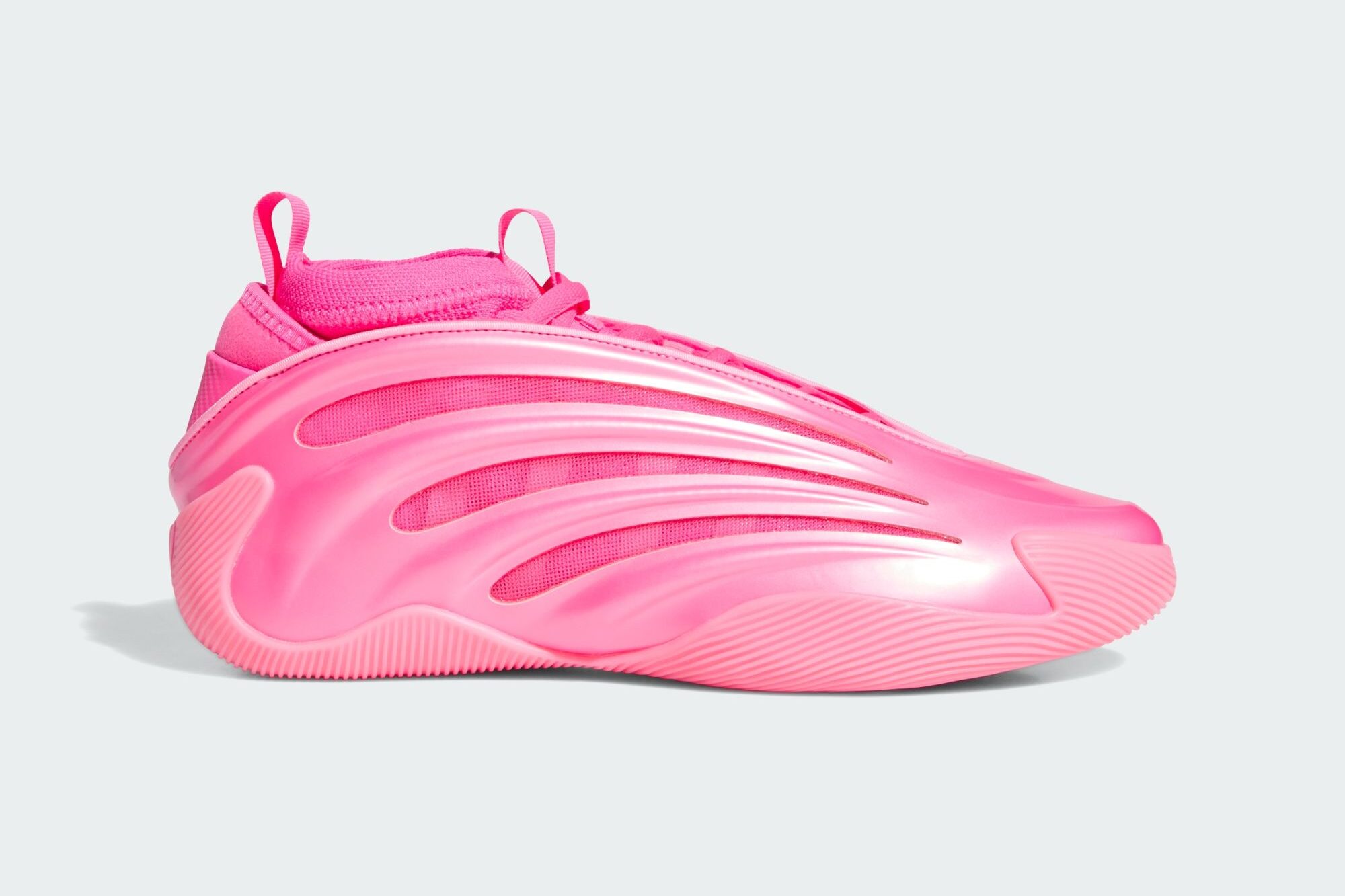 La tige est habillée de deux tons de rose, même chose pour la semelle avec les trois bandes remontant sur le talon, où figure également le logo du joueur. C’est par ailleurs la toute première Harden Vol. 9 composée avec une seule et même couleur, puisque même le coloris “Dynamo”, le seul orné d’une tige unie, entièrement orange, est assorti d’une touche de noir au niveau de la semelle.