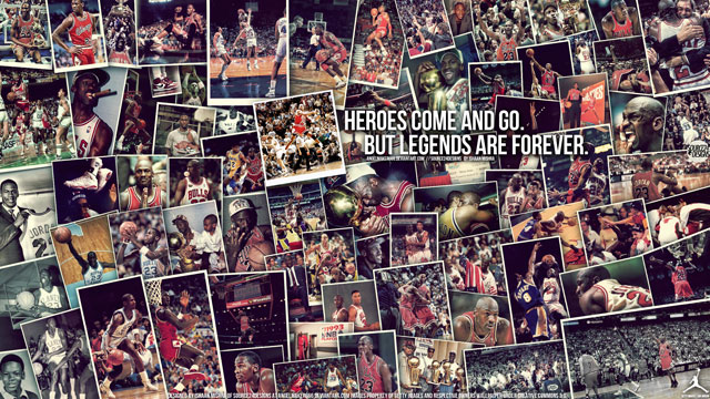 Qu’on traduise ça par “papier peint”, “fond d’écran” ou “arrière plan de Bureau”, le constat est le même : c’est le plus beau des “wallpaper” à la gloire de Michael Jordan avec un slogan qui tue : “les héros vont et viennent, mais les légendes demeurent.”