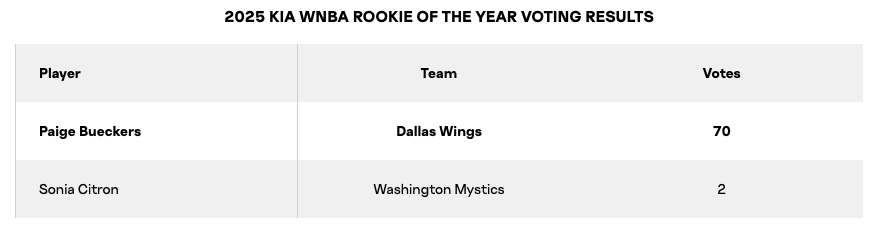 Sans surprise, c’est Paige Bueckers qui a décroché le trophée de « Rookie de l’année » en WNBA. La joueuse des Dallas Wings fait presque l’unanimité, avec 70 voix possibles sur 72, Sonia Citron récoltant les deux autres !