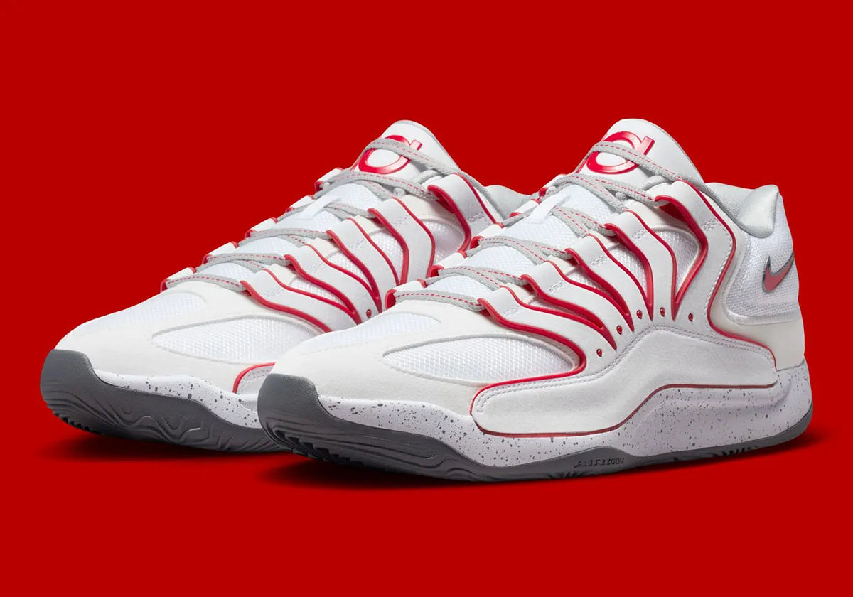 Il aura fallu attendre près de dix coloris, mais cette fois c’est sûr, la KD 18 aura son modèle aux couleurs des Rockets ! Nike a lié l’utile à l’agréable sur cette KD 18 à la tige blanche et rouge et complétée par une semelle grise et blanche tachetée.