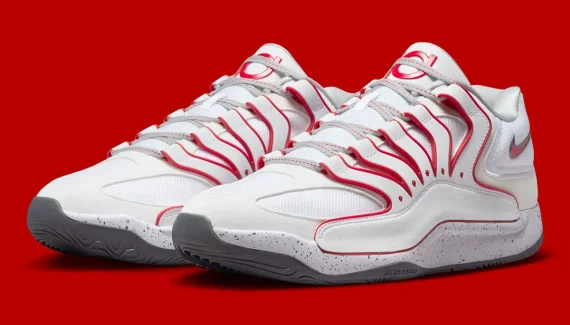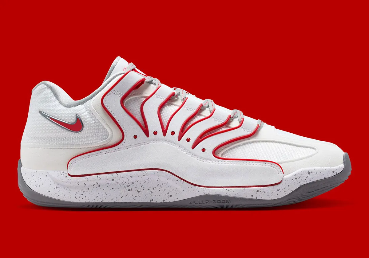 Il aura fallu attendre près de dix coloris, mais cette fois c’est sûr, la KD 18 aura son modèle aux couleurs des Rockets ! Nike a lié l’utile à l’agréable sur cette KD 18 à la tige blanche et rouge et complétée par une semelle grise et blanche tachetée.
