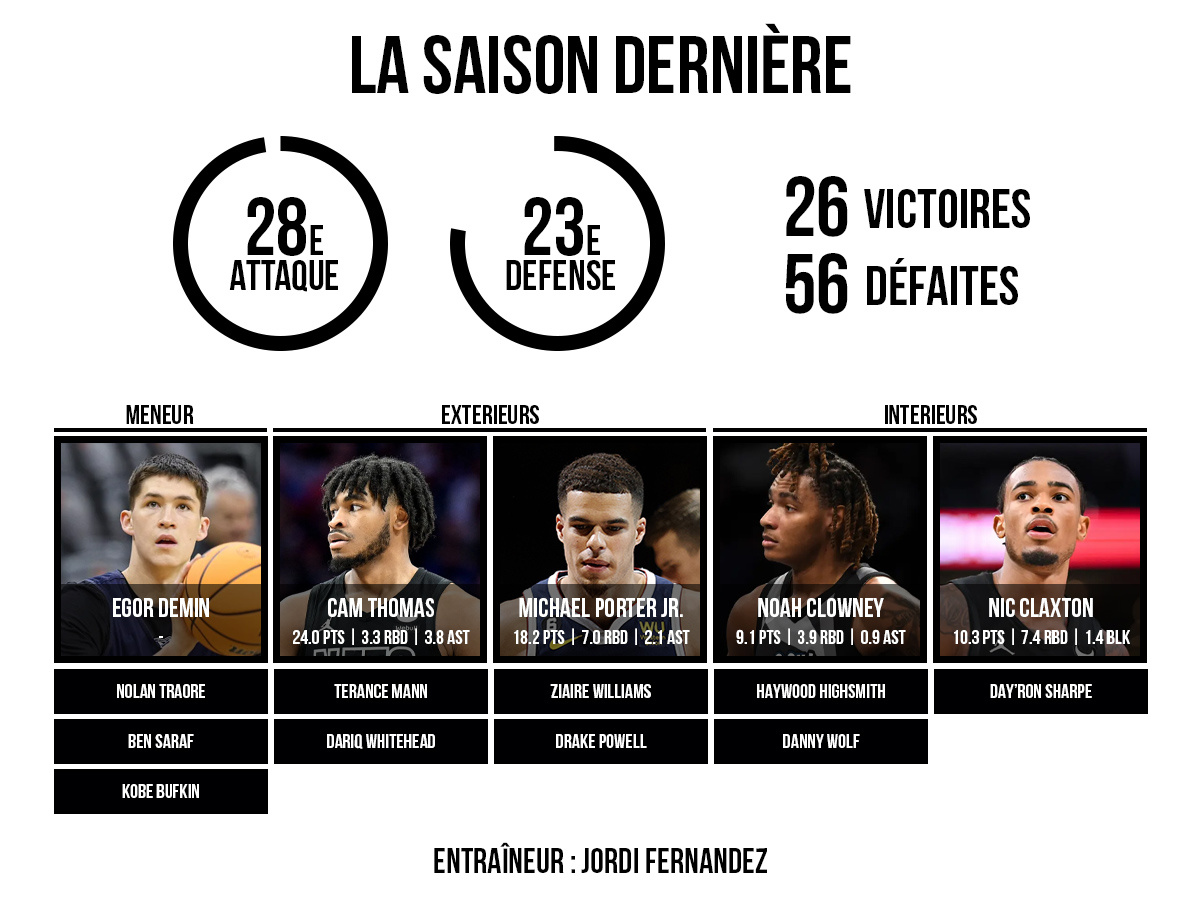 Il ne faudra sans doute pas s’attendre à de la régularité à Brooklyn. De l’envie et du combat seront déjà de bons débuts. Un jeu un peu plus “fun” en attaque aussi, après une saison très moyenne de ce côté du parquet (29e aux points marqués par match, 28e rating offensif, 27e pace) pour le premier exercice de Jordi Fernandez sur le banc. Une opération “tapis” pour espérer terminer dans les hauteurs de la prochaine Draft semble totalement logique, même si elle n’est jamais la garantie d’un choix très haut.