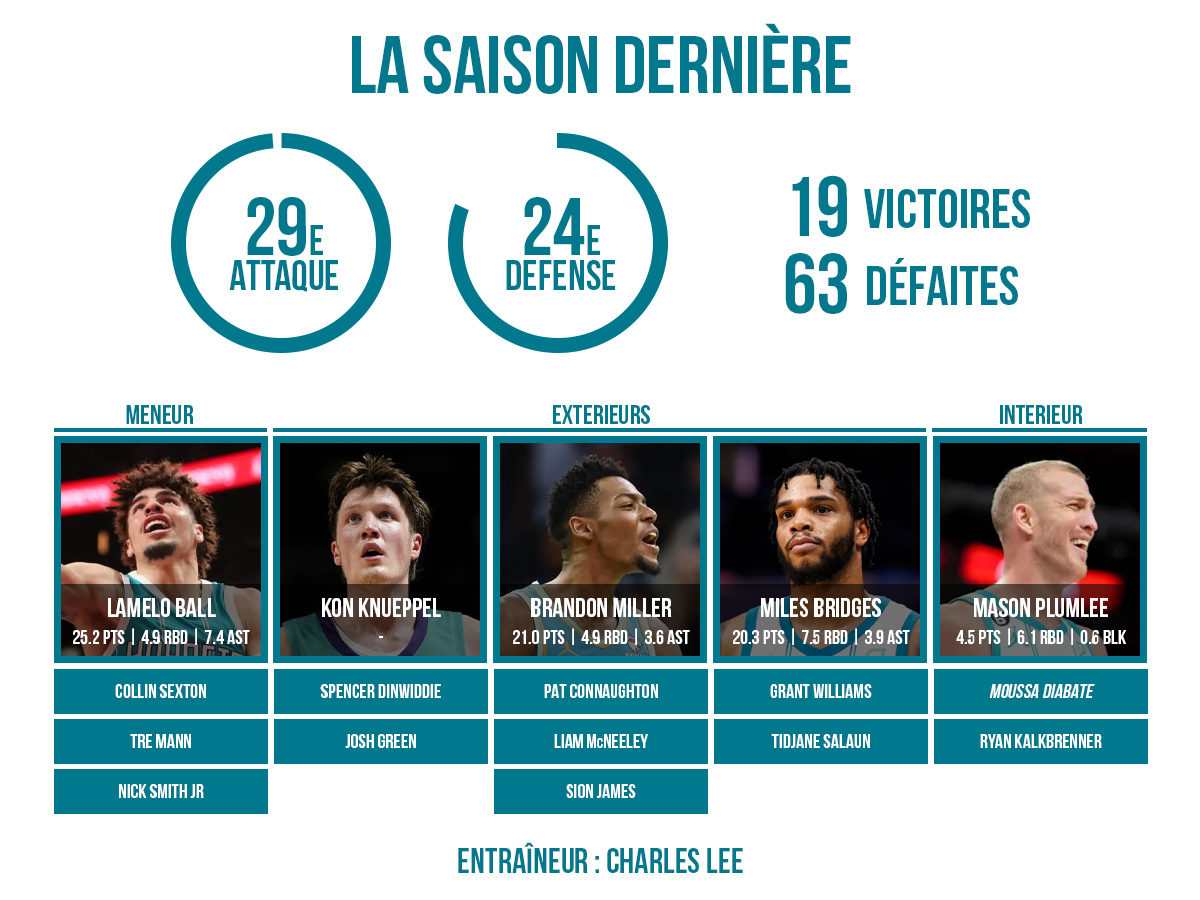 Les fondations sont là avec LaMelo Ball et Brandon Miller, tous les deux partis sur de solides bases avant que les blessures ne s'en mêlent. Après trois saisons plombées par les ennuis de santé, le meneur doit confirmer qu'il peut être le véritable “franchise player” envisagé après ses débuts fracassants dans la ligue.