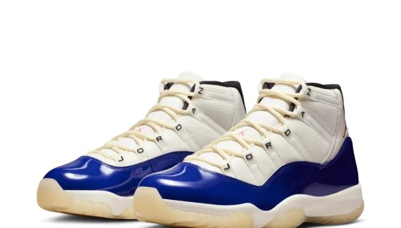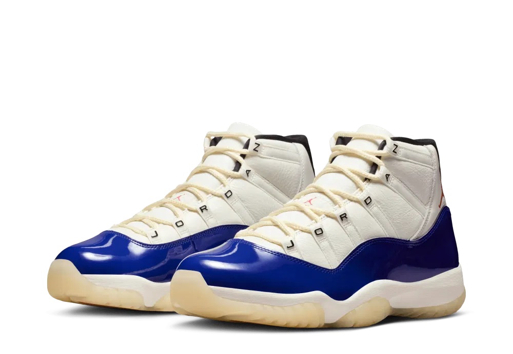Après les Air Jordan 1, 3 et 4, c’est donc au tour de la AJ 11 de reprendre le code couleur « Rare Air », avec une tige blanche assortie d’une base d’un cuir verni bleu foncé, et un « Jumpman » en rouge au niveau du talon. L’ensemble repose sur une semelle extérieure translucide. Simple, mais toujours aussi efficace !