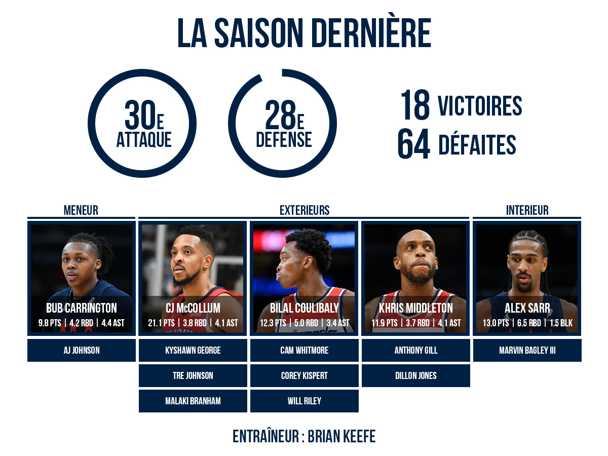 Les rotations seront intéressantes à suivre, notamment comment utiliser C.J. McCollum et Khris Middleton, qui ne sont pas voués à s’inscrire longtemps à Washington. Attention aussi à veiller aux hiérarchies dans le groupe, et à ce que certains joueurs plus gourmands et avides de prouver leur valeur ne vampirisent pas le jeu, comme cela a parfois été le cas ces deux dernières saisons. L’important, c’est en effet la progression du noyau de jeunes joueurs…
